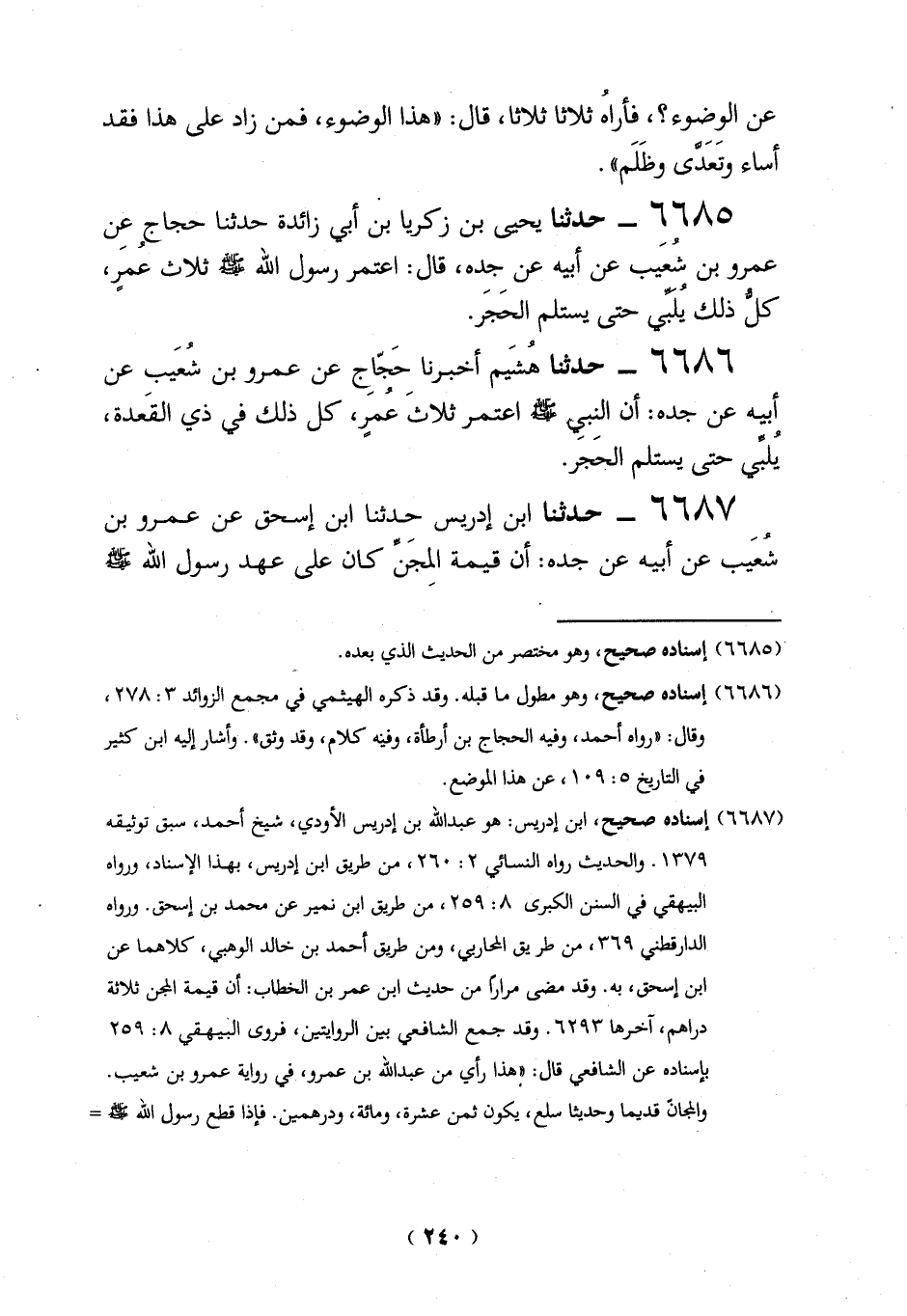 6685 - حدثنا يحيى بن زكريا بن أبي زائدة حدثنا حجاج عِن عمرو بن شعيب عن أبيه عن جده، قال: اعتمر رسول الله -صلي الله عليه وسلم - ثلاث عمرٍ، كلُّ ذلك يُلبّي حتى يستلم الحَجَر.