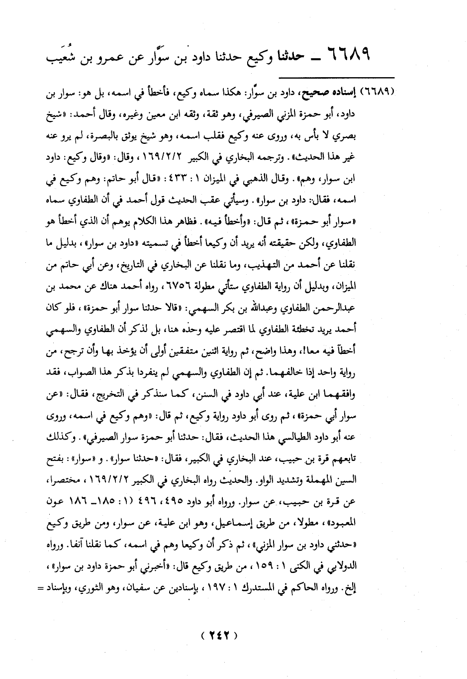 الطفاوي، ولكن حقيقته أنه يريد أن وكيعا أخطأ في تسميته "داود بن سوار"، بدليل ما نقلنا عن أحمد من التهذيب، وما نقلنا عن البخاري في التاريخ، وعن أبي حاتم من الميزان، وبدليل أن رواية الطفاوي ستأتي مطولة 6756، رواه أحمد هناك عن محمد بن عبد الرحمن الطفاوي وعبد الله بن بكر السهمي: "قالا حدثنا سوار أبو حمزة"، فلو كان أحمد يريد تخطئة الطفاوي لما اقتصر عليه وحده هنا، بل لذكر أن الطفاوي والسهمي أخطآ فيه معا!، وهذا واضح، ثم رواية اثنين متفقين أولى أن يؤخذ بها وأن ترجح، من رواية واحد إذا خالفهما. ثم إن الطفاوي والسهمي لم ينفردا بذكر هذا الصواب، فقد