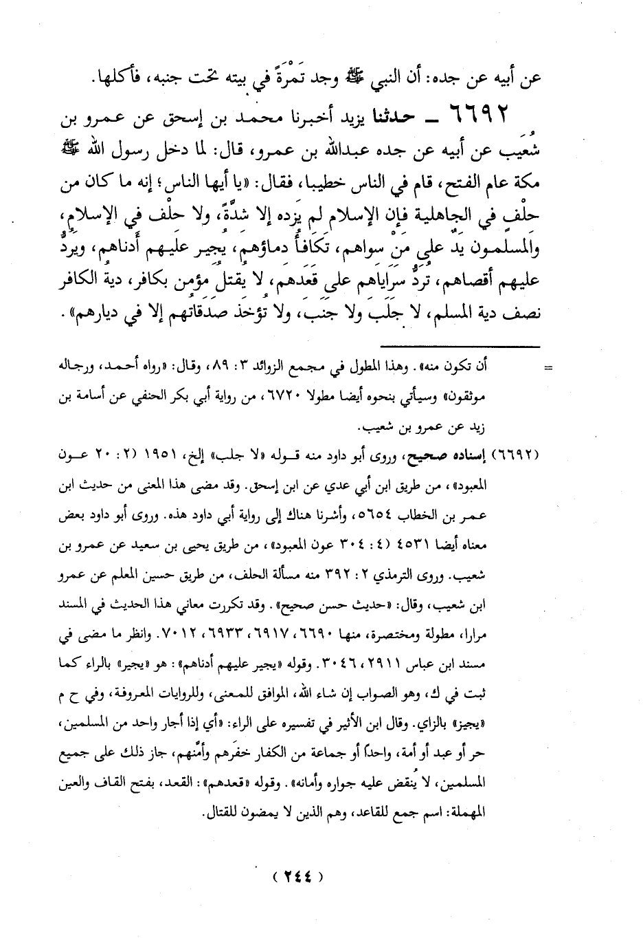 (6692) إسناده صحيح، وروى أبو داود منه قوله "لا جلب" إلخ، 1951 (2: 20 عون المعبود"، من طريق ابن أبي عدي عن ابن إسحق. وقد مضى هذا المعنى من حديث ابن عمر بن الخطاب 5654، وأشرنا هناك إلى رواية أبي داود هذه. وروى أبو داود بعض معناه أيضاً 4531 (4: 304 عون المعبود"، من طريق يحيى بن سعيد عن عمرو بن شعيب. وروى الترمذي 2: 392 منه مسألة الحلف، من طريق حسين المعلم عن عمرو ابن شعيب، وقال: "حديث حسن صحيح". وقد تكررت معاني هذا الحديث في المسند مرارا، مطولة ومختصرة، منها 6690، 6917، 6933، 7012. وانظر ما مضى في مسند ابن عباس 2911، 3046. وقوله "يجير عليهم أدناهم": هو "يجير" بالراء كما ثبت في ك، وهو الصواب إن شاء الله، الموافق للمعنى، وللروايات المعروفة، وفي ح م "يجيز" بالزاي. وقال ابن الأثير في تفسيره على الراء: "أي إذا أجار واحد من المسلمين، حر أو عبد أو أمة، واحداً أو جماعة من الكفار خفَرهم وأمَّنهم، جاز ذلك على جميع المسلمين، لاُ ينقض عليه جواره وأمانه". وقوله "قعدهم": القعد، بفتح القاف والعين المهملة: اسم جمع للقاعد، وهم الذين لا يمضون للقتال.
