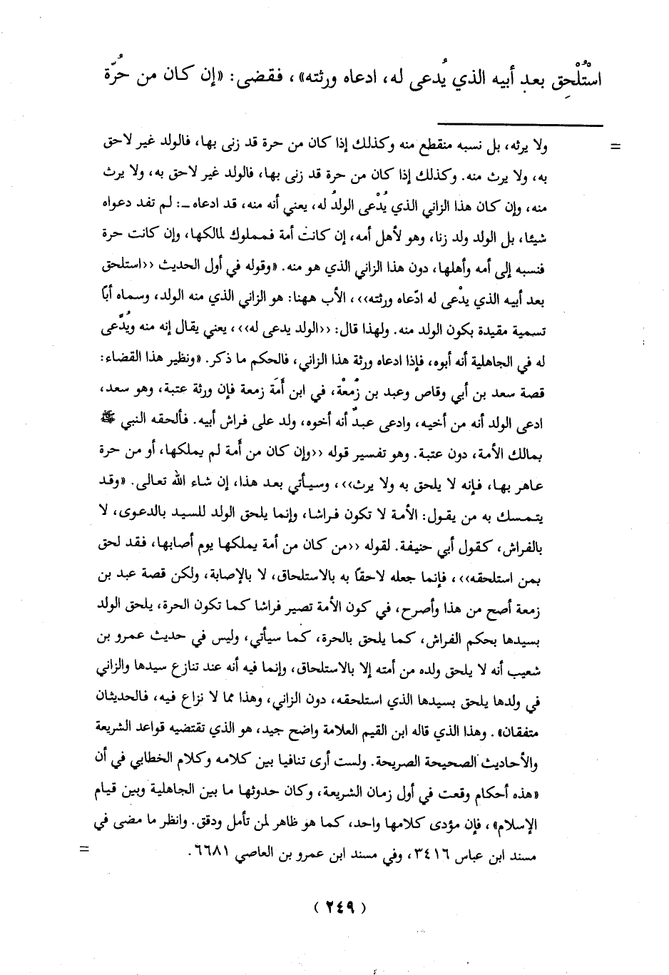 = ولا يرثه، بل نسبه منقطع منه وكذلك إذا كان من حرة قد زنى بها، فالولد غير لاحق به، ولا يرث منه. وكذلك إذا كان من حرة قد زنى بها، فالولد غير لاحق به، ولا يرث منه، وإن كان هذا الزاني الذي يُدْعى الولدُ له، يعني أنه منه، قد ادعاه-: لم تفد دعواه شيئا، بل الولد ولد زنا، وهو لأهل أمه، إن كانت أمة فمملوك لمالكها، وإن كانت حرة فنسبه إلى أمه وأهلها، دون هذا الزاني الذي هو منه. "وقوله في أول الحديث" استلحق بعد أبيه الذي يدْعى له ادّعاه ورثته"، الأب ها هنا: هو الزاني الذي منه الولد، وسماه أباً تسمية مقيدة بكون الولد منه. ولهذا قال:"الولد يدعى له"، يعني يقال إنه منه ويُدعى له في الجاهلية أنه أبوه، فإذا ادعاه ورثة هذا الزاني، فالحكم ما ذكر. "ونظير هذا القضاء: قصة سعد بن أبي وقاص وعبد بن زمعْة، في ابن أمَة زمعة فإن ورثة عتبة، وهو سعد، ادعى الولد أنه من أخيه، وادعى عبد أنه أخوه، ولد على فراش أبيه. فألحقه النبي -صلي الله عليه وسلم - بمالك الأمة، دون عتبة. وهو تفسير قوله "وإن كان من أمة لم يملكها، أو من حرة عاهر بها، فإنه لا يلحق به ولا يرث"، وسيأتي بعد هذا، إن شاء الله تعالى. "وقد يتمسك به من يقول: الأمة لا تكون فراشا، وإنما يلحق الولد للسيد بالدعوى، لا بالفراش، كقول أبي حنيفة. لقوله"من كان من أمة يملكها يوم أصابها، فقد لحق بمن استلحقه"، فإنما جعله لاحقاً به بالاستلحاق، لا بالإصابة، ولكن قصة عبد بن زمعة أصح من هذا وأصرح، في كون الأمة تصير فراشا كما تكون الحرة، يلحق الولد بسيدها بحكم الفراش، كما يلحق بالحرة، كما سيأتي، وليس في حديث عمرو بن شعيب أنه لا يلحق ولده من أمته إلا بالاستلحاق، وإنما فيه أنه عند تنازع سيدها والزاني في ولدها يلحق بسيدها الذي استلحقه، دون الزاني، وهذا مما لا نزاع فيه، فالحديثان متفقان". وهذا الذي قاله ابن القيم العلامة واضح جيد، هو الذي تقتضيه قواعد الشريعة والأحاديث الصحيحة الصريحة. ولست أرى تنافيا بين كلامه وكلام الخطابي في أن "هذه أحكام وقعت في أول زمان الشريعة، وكان حدوثها ما بين الجاهلية وبين قيام