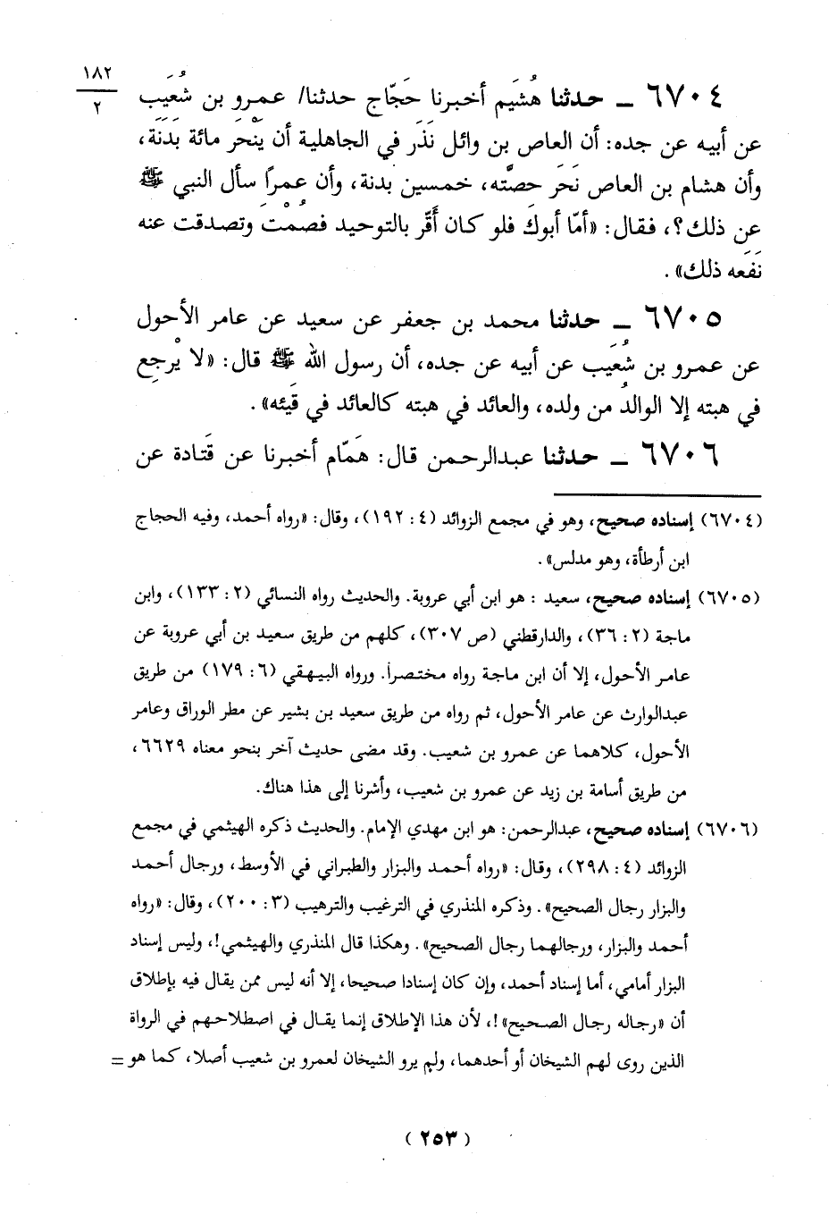 (6705) إسناده صحيح، سعيد: هو ابن أبي عروبة. والحديث رواه النسائي (2: 133)، وابن ماجة (2: 36)، والدارقطني (ص 307)، كلهم من طريق سعيد بن أبي عروبة عن عامر الأحول، إلا أن ابن ماجة رواه مختصراً. ورواه البيهقي (6: 179) من طريق عبد الوارث عن عامر الأحول، ثم رواه من طريق سعيد بن بشير عن مطر الوراق وعامر الأحول، كلاهما عن عمرو بن شعيب. وقد مضى حديث آخر بنحو معناه 6629، من طريق أسامة بن زيد عن عمرو بن شعيب، وأشرنا إلى هذا هناك.