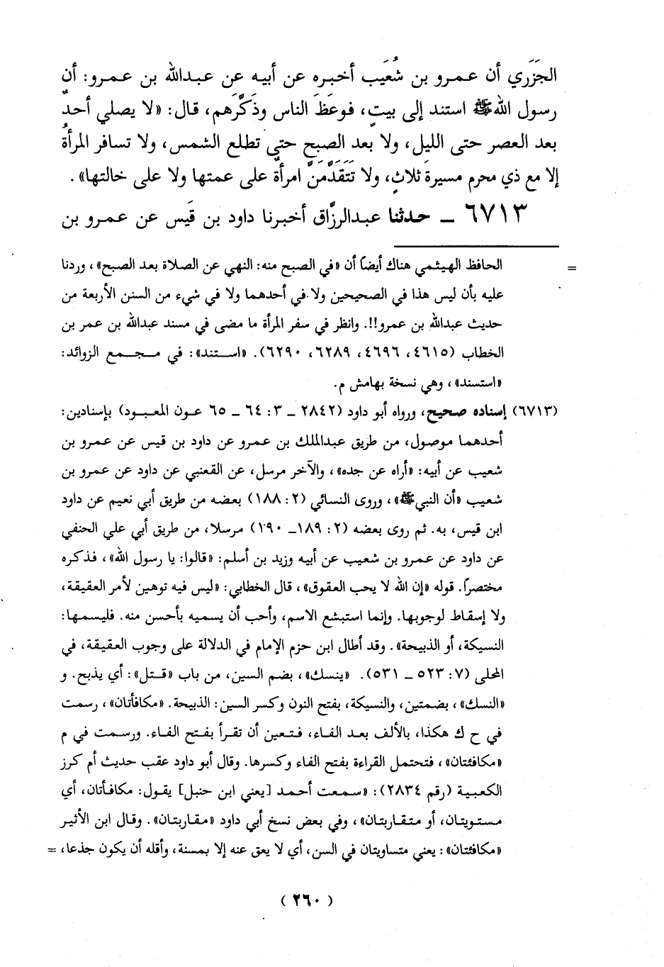 = الحافظ الهيثمي هناك أيضاً أن "في الصبح منه: النهي عن الصلاة بعد الصبح"، وردنا عليه بأن ليس هذا في الصحيحين ولا في أحدهما ولا في شيء من السنن الأربعة من حديث عبد الله بن عمرو!!. وانظر في سفر المرأة ما مضى في مسند عبد الله بن عمر بن الخطاب (4615، 4696، 6289، 6290)."استند": في مجمع الزوائد: "استسند"، وهي نسخة بهامش م.