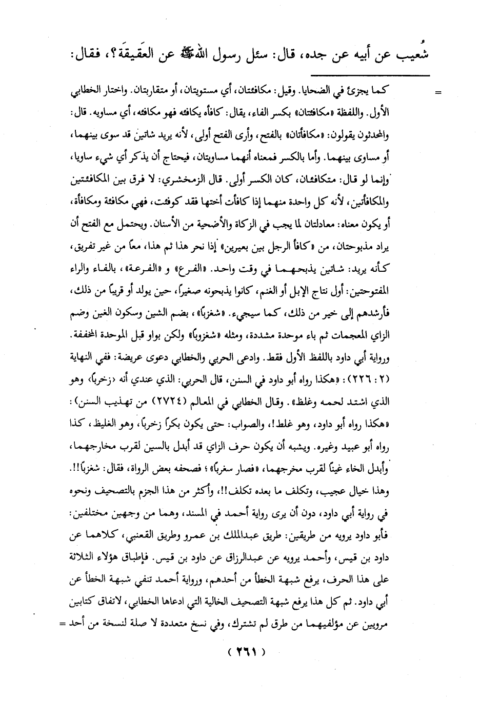 ورواية أبي داود باللفظ الأول فقط. وادعى الحربي والخطابي دعوى عريضة: ففي النهاية (2: 226): "هكذا رواه أبو داود في السنن، قال الحربي: الذي عندي أنه (زخرباً) وهو الذي اشتد لحمه وغلظ". وقال الخطابي في المعالم (2724) من تهذيب السنن): "هكذا رواه أبو داود، وهو غلط!، والصواب: حتى يكون بكراً زخرباً، وهو الغليظ، كذا رواه أبو عبيد وغيره. ويشبه أن يكون حرف الزاي قد أبدل بالسين لقرب مخارجهما، وأبدل الخاء غيناً لقرب مخرجهما، "فصارسغرباً"؛ فصحفه بعض الرواة، فقال: شغزباً!!.