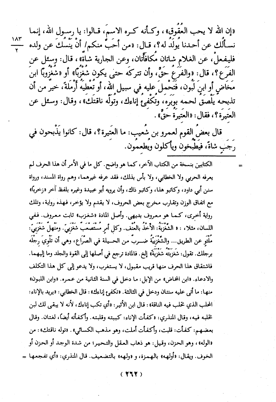 "إن الله لا يحب العُقُوق"، وكأنه كره الاسمَ، قالوا: يا رسول الله، إنما نسألك عن أحدنا يُولدُ له؟، قال: "من احَبَّ منكم أَن يَنْسُكَ عن ولده فليفعلْ، عن الغلامٍ شاتان مُكافأتان، وعن الجارية شاةٌ"، قال: وسئل عن الفَرَع؟، قال: "والفرعُ حَق، وأن تتركَه حتى يكون شغْزُبا" أو "شُغْزُوباً ابنَ مَخَاضٍ أو ابنَ لبون، فتِحمِلَ عليه في سبيل الله، أو تُعْطيَهُ أرْمَلةً، خيرٌ من أن تذبحه يَلْصَق لحمه بوبرِه، وتكْفِئ إناءك، وقوله ناقتَكَ"، وقال: وسئل عن العَتِيرَة؟، فقال: "العَتِيرَةُ حقُّ".