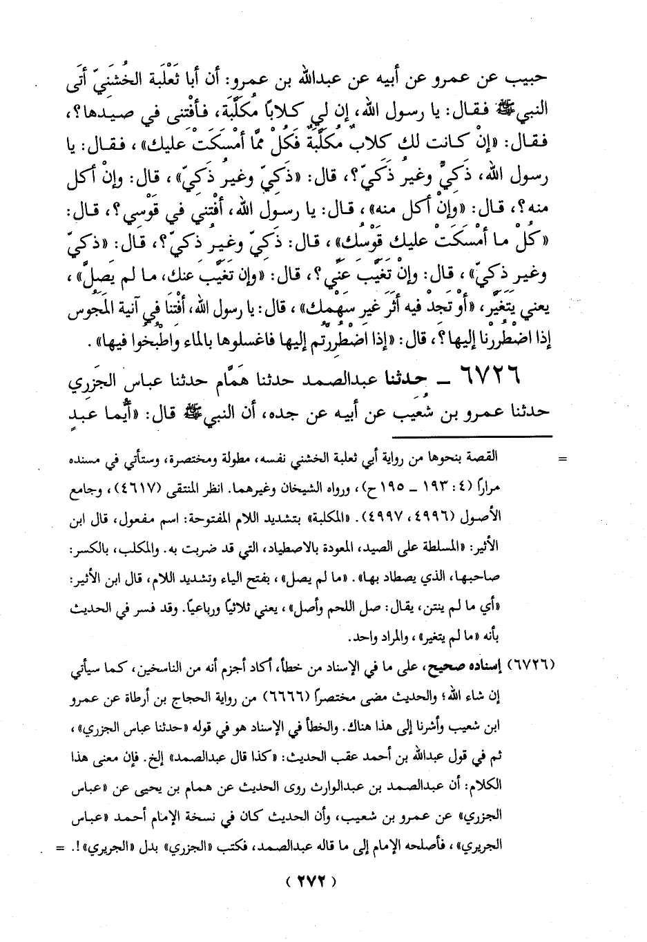 حبيب عن عمرو عن أبيه عن عبد الله بن عمرو: أن أبا ثَعْلَبة الخُشَنِيّ أتَى النبي -صلي الله عليه وسلم - فقال: يا رسول الله، إن لي كلاباً مُكلَّبَة، فأفْتنى في صيدها؟، فقال: "إنْ كانت لك كلابٌ مُكلَّبَةٌ فَكُلْ ممَّا أمْسَكَتْ عليك"، فقال: يا رسول الله، ذَكِيُّ وغيرُ ذَكَيّ؟، قال: "ذَكِيّ وغيرُ ذَكِيّ"، قال: وإنْ أكل منه؟، قال: "وإنْ أكل منه"، قال: يا رسول الله، أفْتني في قَوْسِي؟، قال: "كُلْ ما أمْسَكَتْ عليك قَوْسُك"، قال: ذَكيّ وغيرُ ذكيّ؟، قال: "ذكيّ وغير ذكيّ"، قال: وإنْ تَغيبَ عني؟، قال: "وإن تَغيبَ عنك، ما لم يَصلَّ"، يعني يَتغيَّر، "أوْتَجدْ فيه أثَرَ غيرِ سَهمك"، قال: يا رسول الله، أفْتِنَا في آنية المَجوس إذا اضْطُررْنا إليها؟، قال: "إذا اضْطررتم إليها فاغسلوها بالماء واطبخوا فيها".