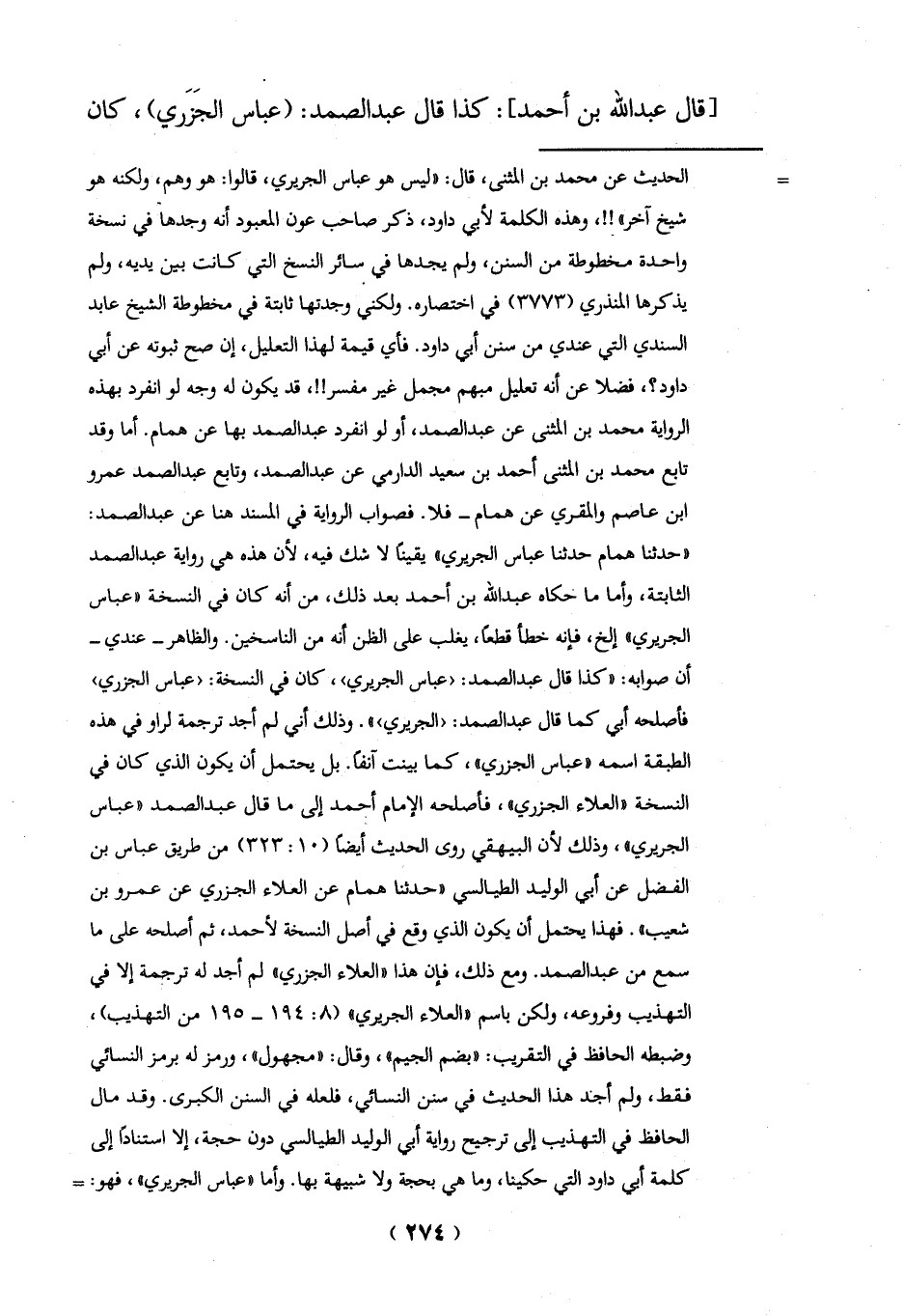 الطبقة اسمه "عباس الجزري"، كما بينت آنفاً. بل يحتمل أن يكون الذي كان في النسخة "العلاء الجزري"، فأصلحه الإِمام أحمد إلى ما قال عبد الصمد "عباس الجريري"، وذلك لأن البيهقي روى الحديث أيضاً (10: 323) من طريق عباس بن الفضل عن أبي الوليد الطيالسي "حدثنا همام عن العلاء الجزري عن عمرو بن شعيب". فهذا يحتمل أن يكون الذي وقع في أصل النسخة لأحمد، ثم أصلحه على ما سمع من عبد الصمد. ومع ذلك، فإن هذا "العلاء الجزري" لم أجد له ترجمة إلا في