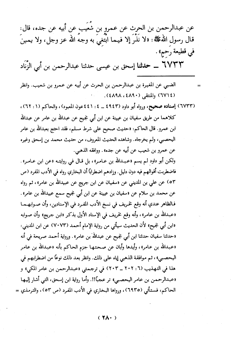 فالظاهر عندي أنه وقع تحريف في نسخ الأدب المفرد في الإسنادين، وأن صوابهما "عبد الله بن عامر"، وأنه وقع تحريف في الإسناد الأول بذكر "ابن جُريج" وأن صوابه "ابن أبي نجيح" لأن الحديث سيأتي من رواية الإِمام أحمد (7073) عن ابن المديني: "حدثنا سفيان حدثنا ابن أبي نجيح عن عبد الله بن عامر". ورواية أحمد صريحة في أنه "عبد الله بن عامر"، وأيدها وأبان عن صحتها جزم الحاكم بأنه "عبد الله بن عامر اليحصبي"، ثم موافقة الذهبي إياه على ذلك. وانظر بعد ذلك نوعاً من اضطرابهم في