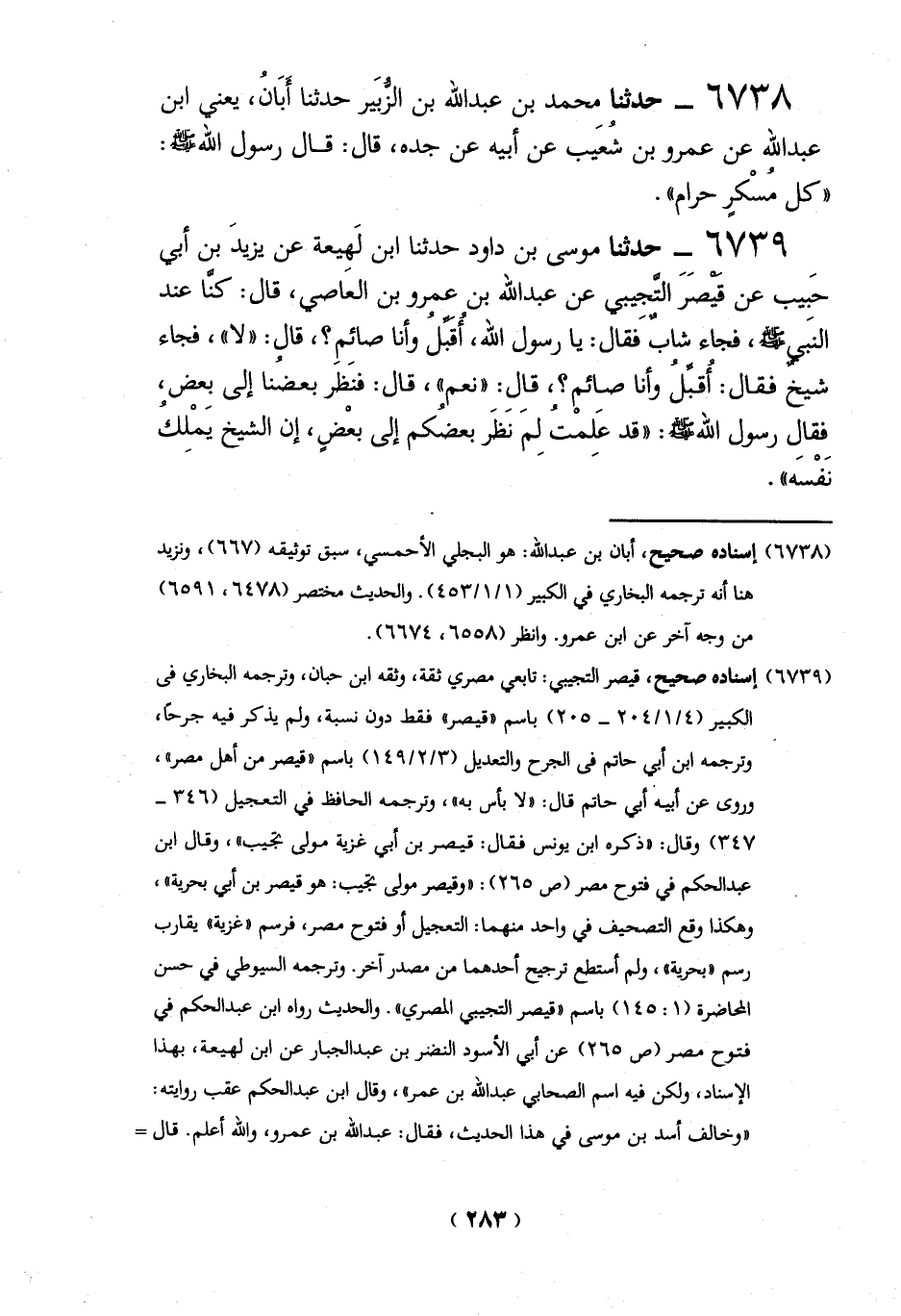 (6739) إسناده صحيح، قيصر التجيبي: تابعي مصري ثقة، وثقه ابن حبان، وترجمه البخاري في الكبير (4/ 1/ 204 - 205) باسم "قيصر" فقط دون نسبة، ولم يذكر فيه جرحاً، وترجمه ابن أبي حاتم في الجرح والتعديل (3/ 2/ 149) باسم "قيصر من أهل مصر"، وروى عن أبيه أبي حاتم قال: "لا بأس به"، وترجمه الحافظ في التعجيل (346 - 347) وقال: "ذكره ابن يونس فقال: قيصر بن أبي غزية مولى تجيب"، وقال ابن عبد الحكم في فتوح مصر (ص 265): "وقيصر مولى تجيب: هو قيصر بن أبي بحرية"، وهكذا وقع التصحيف في واحد منهما: التعجيل أو فتوح مصر، فرسم "غزية" يقارب رسم "بحرية"، ولم أستطع ترجيح أحدهما من مصدرآخر. وترجمه السيوطي في حسن المحاضرة (1: 145) باسم "قيصر التجيبي المصري". والحديث رواه ابن عبد الحكم في فتوح مصر (ص 265) عن أبي الأسود النضر بن عبد الجبار عن ابن لهيعة، بهذا الإسناد، ولكن فيه اسم الصحابي عبد الله بن عمر"، وقال ابن عبد الحكم عقب روايته: "وخالف أسد بن موسى في هذا الحديث، فقال: عبد الله بن عمرو، والله أعلم. قال =