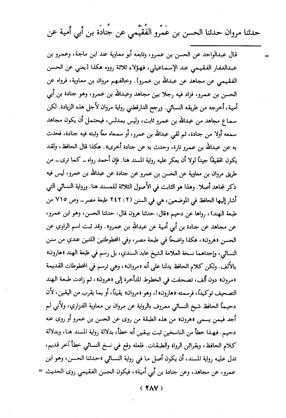 النسائي، وإحداهما نسخة العلامة الشيخ عابد السندي، بل رسم في طبعة الهند "هارون" بالألف. ولكن كلام الحافظ يدلنا على أنه "مروان"، وهي ترسم في المخطوطات القديمة "مرون" دون ألف، تصحفت في الخطوط المتأخرة إلى "هرون"، ثم زادت طبعة الهند التصحيف توكيداً، فرسمته "هارون"!، وهو "مروان" يقيناً، أو بما يقرب من اليقين, لأن دحيماً الحافظ شيخ النسائي معروف بالرواية عن مروان بن معاوية الفزاري، ولأني لم أجد فيمن يسمى "هرون" من هذه الطبقة من روى عن الحسن بن عمرو أو روى عنه دحيم. فهذا خطأ من الناسخين ثبت بيقين أنه خطأ، بدلالة رواية المسند هنا, وبدلالة كلام الحافظ، وبقرائن الرواة والطبقات. فلعله وقع في نسخ النسائي خطأ آخر قديم، تدل عليه رواية المسند، أن يكون أجل ما في رواية النسائي "حدثنا الحسن، وهو ابن عمرو، عن مجاهد، وعن جنادة بن أبي أمية"، فيكون الحسن الفقيمي روى الحديث =