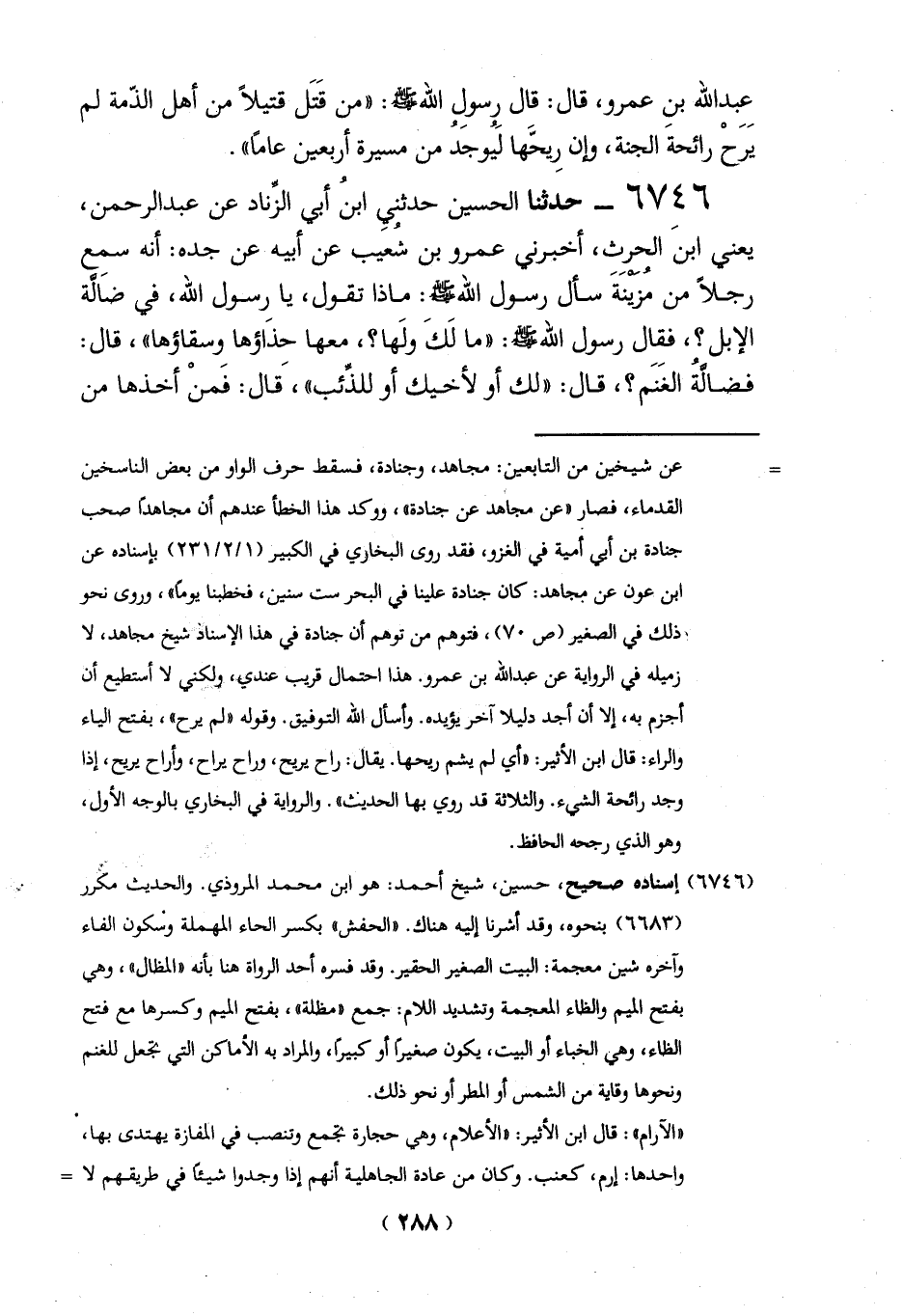 = عن شيخين من التابعين: مجاهد، وجنادة، فسقط حرف الواو من بعض الناسخين القدماء، فصارا "عن مجاهد عن جنادة"، ووكد هذا الخطأ عندهم أن مجاهداً صحب جنادة بن أبي أمية في الغزو، فقد روى البخاري في الكبير (1/ 2/ 231) بإسناده عن ابن عون عن مجاهد: كان جنادة علينا في البحر ست سنين، فخطبنا يوماً"، وروى نحو ذلك في الصغير (ص 70)، فتوهم من توهم أن جنادة في هذا الإسناد شيخ مجاهد، لا زميله في الرواية عن عبد الله بن عمرو. هذا احتمال قريب عندي، ولكني لا أستطيع أن أجزم به، إلا أن أجد دليلاً آخر يؤيده. وأسأل الله التوفيق. وقوله "لم يرح"، بفتح الياء
