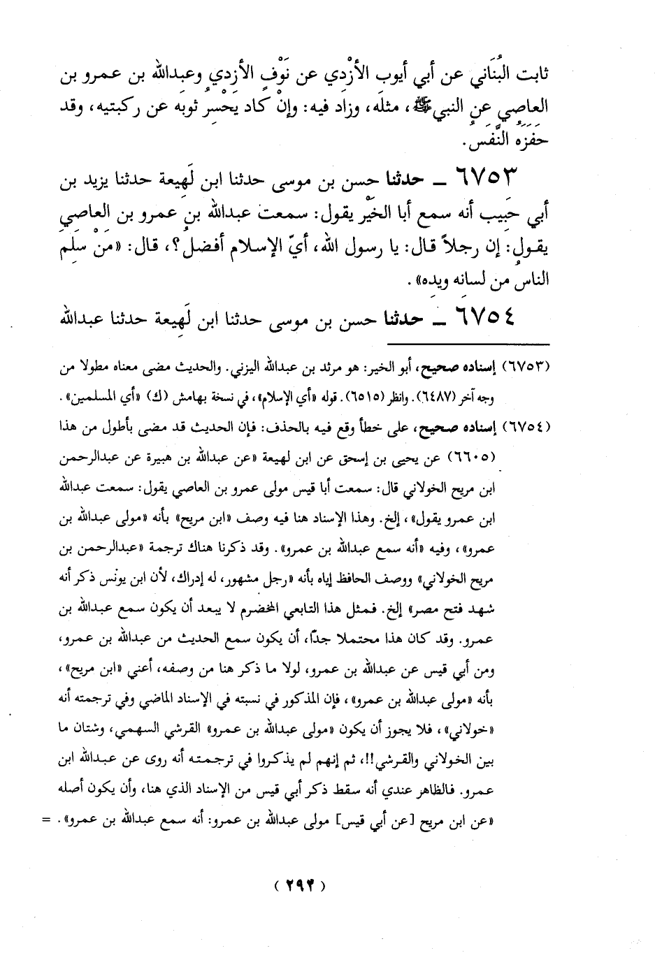 6753 - حدثنا حسن بن موسى حدثنا ابن لَهِيعة حدثنا يزيد بن أبي حَبيب أنه سمع أبا الخَيْر يقول: سمعت عبد الله بن عمرو بن الِعاصيِ يقول: إن رجلاً قال: يا رسول الله، أيّ الإِسلام أفضلُ؟، قال: "منْ سَلِم الناسُ من لسانه ويده".