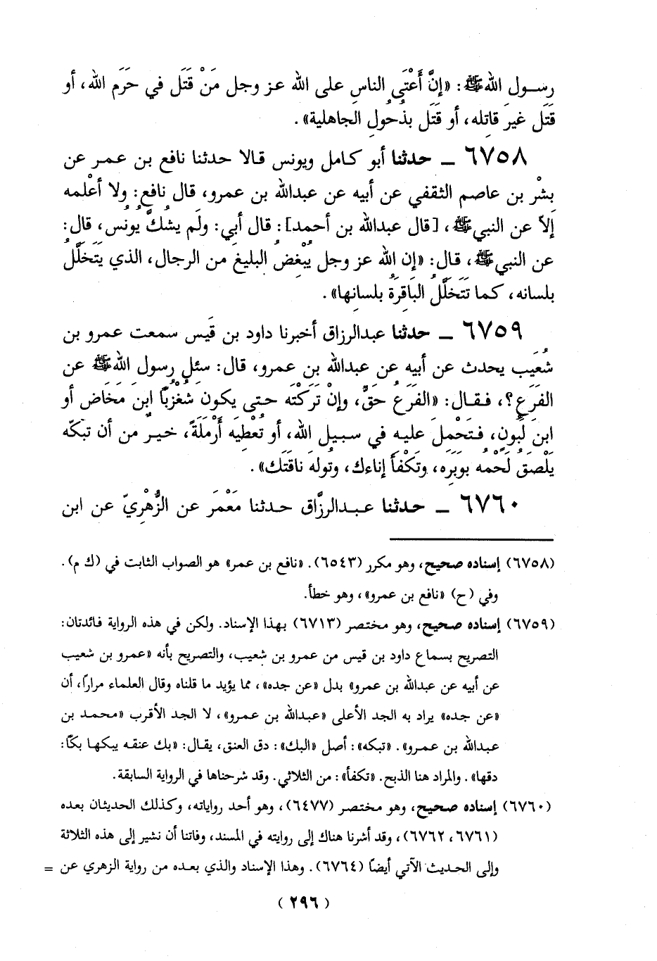 (6759) إسناده صحيح، وهو مختصر (6713) بهذا الإسناد. ولكن في هذه الرواية فائدتان: التصريح بسماع داود بن قيس من عمرو بن شعيب، والتصريح بأنه "عمرو بن شعيب عن أبيه عن عبد الله بن عمرو" بدل "عن جده"، مما يؤيد ما قلناه وقال العلماء مراراً، أن "عن جده" يراد به الجد الأعلى "عبد الله بر عمرو"، لا الجد الأقرب "محمَّد بن عبد الله بن عمرو". "تبكه": أصل "البك": دق العنق، يقال: "بك عنقه يبكها بكاً: دقها". والمراد هنا الذبح. "تكفأ": من الثلاثي. وقد شرحناها في الرواية السابقة.