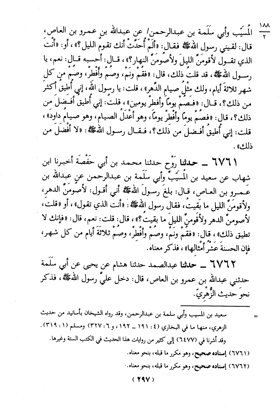 المُسيب وأبي سَلَمة بن عبد الرحمن عن عبد الله بن عمرو بن العاص، قال: لقيني رسول الله -صلي الله عليه وسلم - فقال: "ألَمْ أحَدَّثْ أنك تقومُ الليل؟ "، أو: "أنْتَ الذي تقول لأقومَنَّ الليلَ ولأصُومَنَّ النهار؟ "، قال: أحسبه قال: نعم، يا رسول الله -صلي الله عليه وسلم -، قد قلتُ ذلك، قال: "فقُمْ ونمْ، وصُمْ وأفْطرْ، وصُمْ من كل شهر ثلاثةَ أيام، ولك مِثْلُ صيامِ الدَّهر"، قلت: يا رسول الله، إني أُطيقُ أكثرَ من ذلك؟، قال: "فصُمْ يوماً وأفطرْ يومين"، قلتُ: إني أُطيق أفَضلَ من ذلك؟، قال: "فصُمْ يوماً وأفْطرْ يوماً، وهو أعْدَلُ الصيام، وهو صيامُ داودَ"، قلت: إني أُطيقُ أفضلَ من ذَلك؟، فقال رسول الله -صلي الله عليه وسلم -: "لا أفْضَلَ من ذلك".