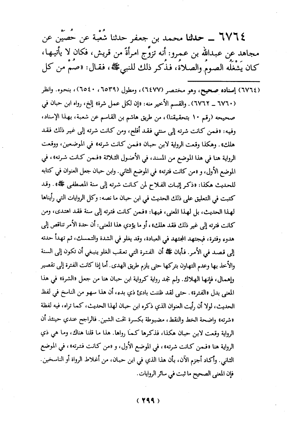 (6764) إسناده صحيح، وهو مختصر (6477)، ومطول (6539، 6540)، بنحوه. وانظر (6760 - 6762). والقسم الأخير منه: "إن لكل عمل شرة" إلخ، رواه ابن حبان في صحيحه (رقم 10 بتحقيقنا)، من طريق هاشم بن القاسم عن شُعبة، بهذا الإسناد، وفيه: "فمن كانت شرته إلى سنتي فقد أفلح، ومن كانت شرته إلى غير ذلك فقد هلك". وهكذا وقعت الرواية لابن حبان "فمن كانت شرته" في الموضعين، ووقعت الرواية هنا في هذا الموضع من المسند، في الأصول الثلاثة "فمن كانت شرته"، في الموضع الأول، و "من كانت فترته" في الموضع الثاني. وابن حبان جعل العنوان في كتابه للحديث هكذا: "ذكر إثبات الفلاح لمن كانت شرته إلى سنة المصطفى - صلى الله عليه وسلم -". وقد كتبت في التعليق على ذلك الحديث في ابن حبان ما نصه: وكل الروايات التي رأيناها لهذا الحديث، بل لهذا المعنى، فيها: "فمن كانت فترته إلى سنة فقد اهتدى، ومن كانت فترته إلى غير ذلك فقد هلك"، أو ما يؤدي هذا المعنى: أن حدة الأمر تناقص إلى هدوء وفترة، فيجتهد المجتهد في العبادة، وقد يغلو في الشدة والتمسك، ثم تهدأ حدته إلى قصد في الأمر. فأبان - صلى الله عليه وسلم - أن الفترة التي تعقب الغلو ينبغي أن تكون إلى السنة والأخذ بها وعدم التهاون بتركها حتى يلزم طريق الهدى. أما إذا كانت الفترة إلى تقصير وإهمال، فإنها الهلاك. ولم نجد رواية كرواية ابن حبان هنا من جعل "الشرة" في هذا المعنى بدل "الفترة". حتى لقد ظننت بادئ ذي بدء، أن هذا سهو من الناسخ في لفظ الحديث، لولا أن رأيت العنوان الذي ذكره ابن حبان لهذا الحديث، كما تراه، فيه لفظة "شرته" واضحة الخط والنقط، مضبوطة بكسرة تحت الشين. فالراجح عندي حينئذ أن الرواية وقعت لابن حبان هكذا، فذكرها كما رواها. هذا ما قلنا هناك، وما هي ذي الرواية هنا "فمن كانت شرته"، في الموضع الأول، و"من كانت فترته"، في الموضع الثاني. وأكاد أجزم الآن، بأن هذا الذي في ابن حبان، من أغلاط الرواة أو الناسخين.