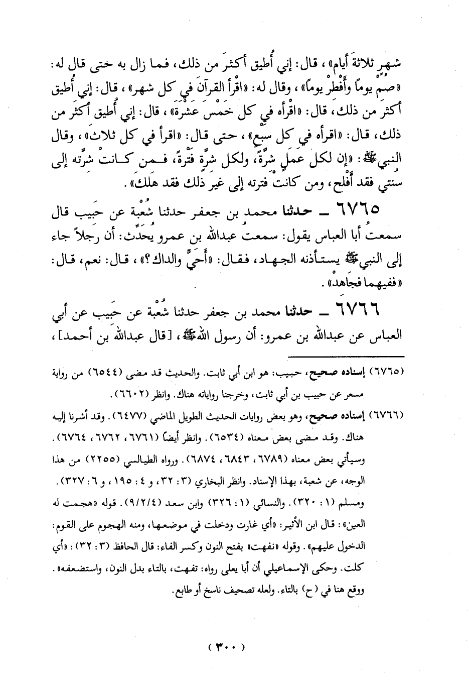 6766 - حدثنا محمَّد بن جعفر حدثنا شُعْبة عن حَبِيب عن أبي العباس عن عبد الله بن عمرو: أن رسول الله -صلي الله عليه وسلم -، [قال عبد الله بن أحمد]،