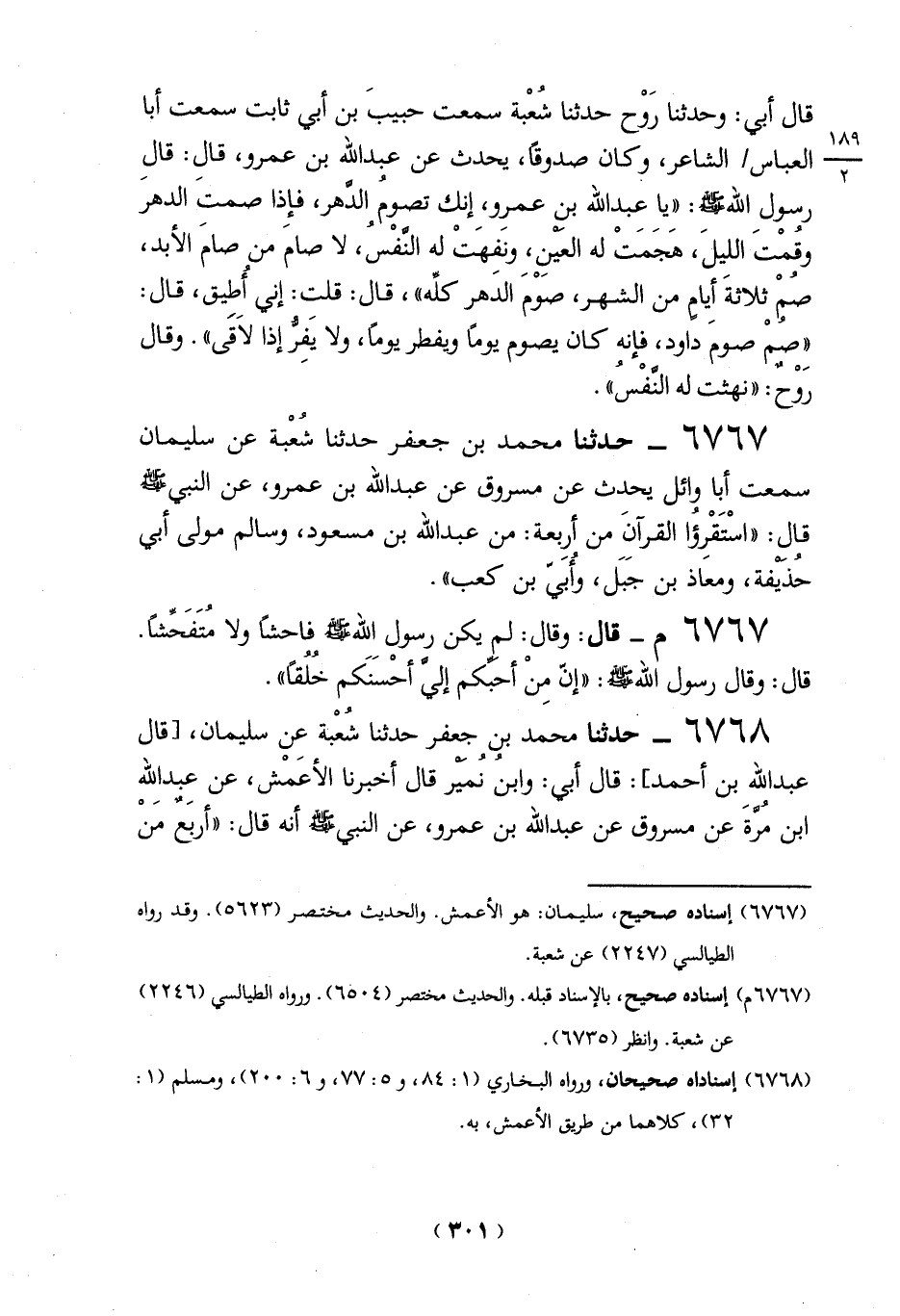 قال أبي: وحدثنا رَوْح حدثنا شُعْبة سمعت حبيبَ بن أبي ثابت سمعت أبا العباس الشاعر، وكان صدوقاً، يحدث عن عبد الله بن عمرو، قال: قالِ رسول الله -صلي الله عليه وسلم -: "يا عبد الله بن عمرِو، إنك تصوم الدَّهر، فإذا صمتَ الدهر وقُمْتَ الليلَ، هَجَمَتْ له العين، ونفهَتْ له النَّفسُ، لا صامَ من صامَ الأبد، صُمْ ثلاثةَ أيا من الشهر، صَوْمَ الدَهر كلِّه"، قال: قلت: إني أُطيق، قال: "صمْ صومَ داود، فإنه كان يصوم يوماً ويفطر يوما, ولا يَفِرُّ إذا لاَقَى". وقال روْحٌ: "نهثت له النَّفْسُ".