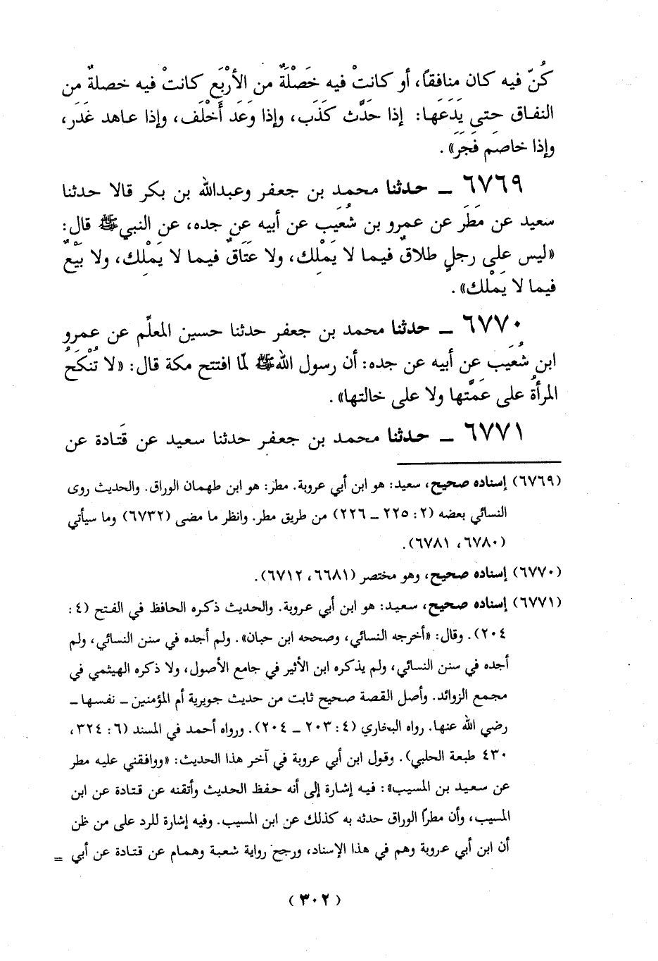 6770 - حدثنا محمَّد بن جعفر حدثنا حسين المعلِّم عن عمرو ابن شُعيب عن أبيه عن جده: أن رسول الله -صلي الله عليه وسلم - لما افتتح مكة قال: "لا تنْكَحُ المرأةُ على عَمَّتها ولا على خالتها".