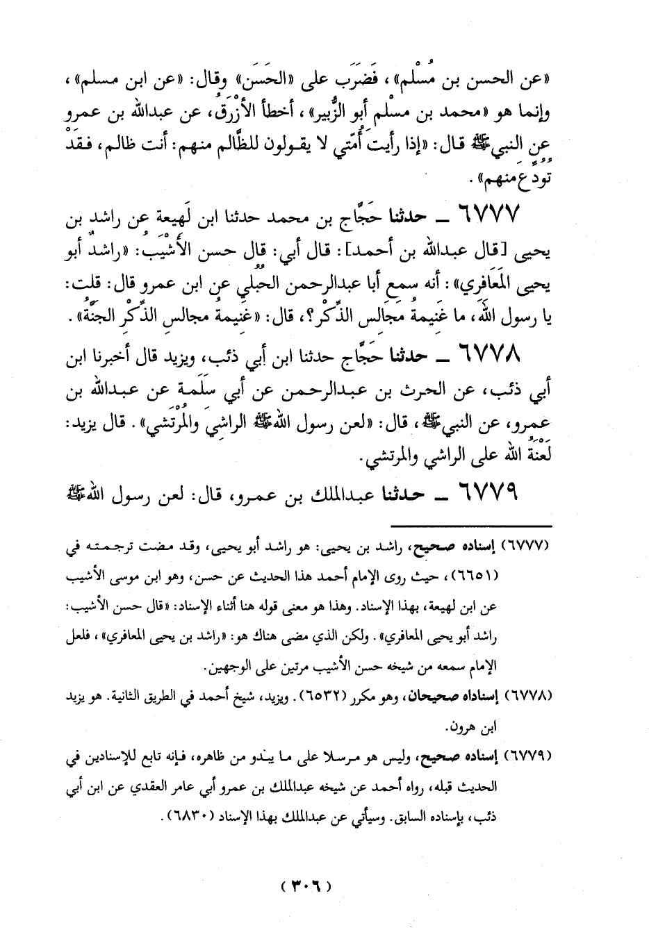 6777 - حدثنا حَجَّاج بن محمَّد حدثنا ابن لَهيعة عن راشد بن يحيى [قال عبد الله بن أحمد]: قال أبي: قال حسن الأشْيَب: "راشدٌ أبو يحيى المَعَافرِي": أنه سمِعِ أبا عبد الرحمن الحُبُليِ عن ابن عمرو قال: قلت: يا رسول الله، ما غَنيمة مجالِس الذِّكْر؟، قال: "غنِيمة مجالسِ الذِّكْرِ الجنة".