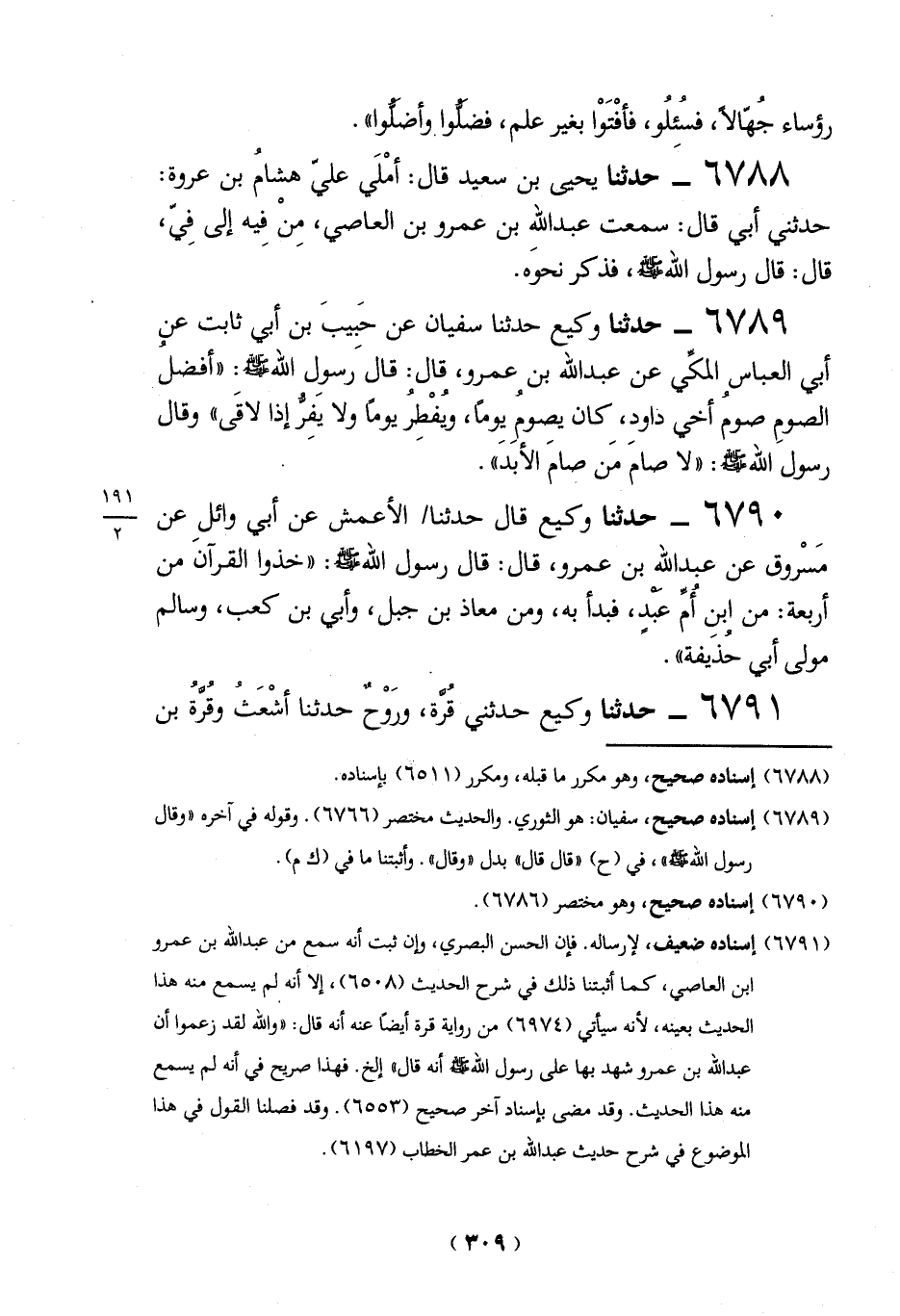 6788 - حدثنا يحيى بن سعيد قال: أمْلَي علي هشام بن عروة: حدثني أبي قال: سمعت عبد اللهِ بن عمرو بن العاصي، مِنْ فِيه إلى فيّ، قال: قال رسول الله -صلي الله عليه وسلم -، فذكر نحوه.