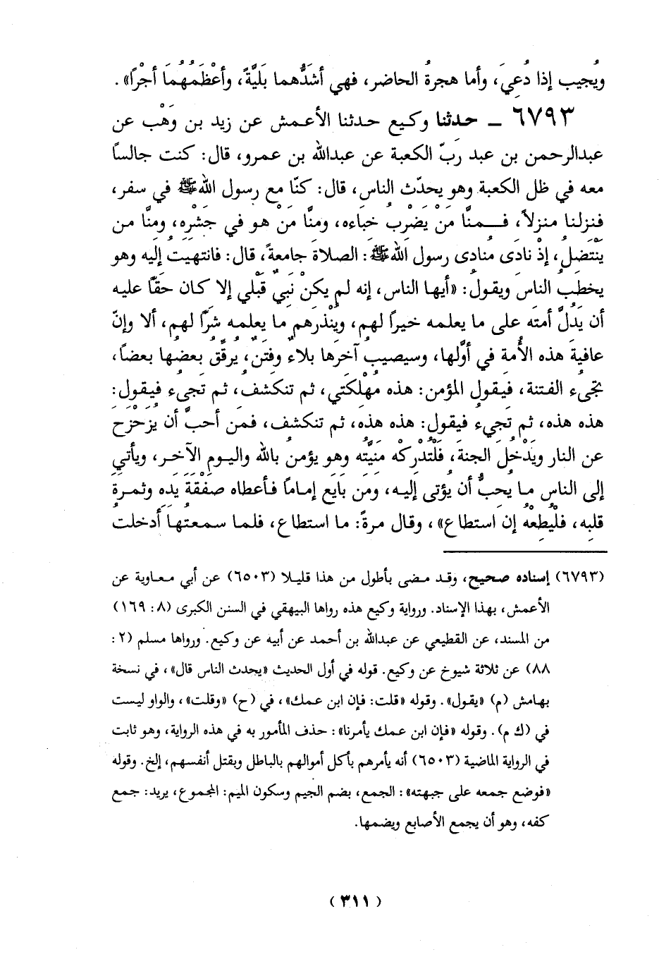 6793 - حدثنا وكيع حدثنا الأعمش عن زيد بن وَهْب عن عبد الرحمن بن عبد رَب الكعبة عن عبد الله بن عمرو، قال: كنت جالساً معه في ظل الكعبة. وهوِ يحدِّث الناسِ، قال: كنّاِ مع رسول الله - صلى الله عليه وسلم - في سفر، فنزلنا منزلاً، فمنَّا منْ يضْرِب خباءه، ومنَّا منْ هو في جشْره، ومنَّا من ينتَضلُ، إذْ نادِى مُنادي رسول الله -صلي الله عليه وسلم -: الصلاةَ جاِمعةً، قال: فانتهيت إلَيه وهو يخطَب الناس ويقولُ: "أيها الناس، إنه لم يكِنْ نبِي قبلي إلا كِان حَقاً عليه أن يَدلَّ أمتَه على ما يعلمه خيراً لهم، وينْذرهم ما يعلمه شراً لهم، ألا وإنّ عافيةَ هذه الأُمةِ في أوَّلها، وسيصيبُ آخرَها بلاءً وفتَن، يرقِّق بعضها بعضاً، تجىء الفتنة، فيقول المؤمن: هذه مُهْلِكَتي، ثم تنكَشف، ثم تَجيء فيِقولِ: