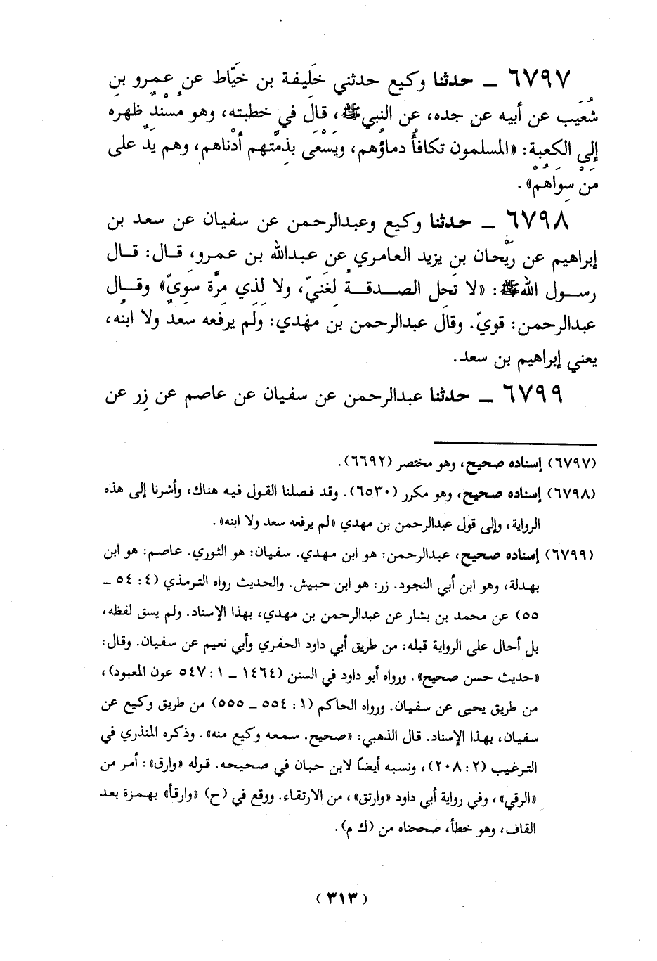 6797 - حدثنا وكيع حدثني خَليفة بن خَيّاط عن عمرو بن شُعَيب عن أبيه عن جده، عن النبي -صلي الله عليه وسلم -، قاِلَ في خطبته، وهو مُسْندٌ ظهرَه إلِى الكعبة: "المسلمون تكافأُ دماؤُهم، ويسْعى بذِمَّتهم أدْناهم، وهم يَد على منْ سِوَاهُمْ".