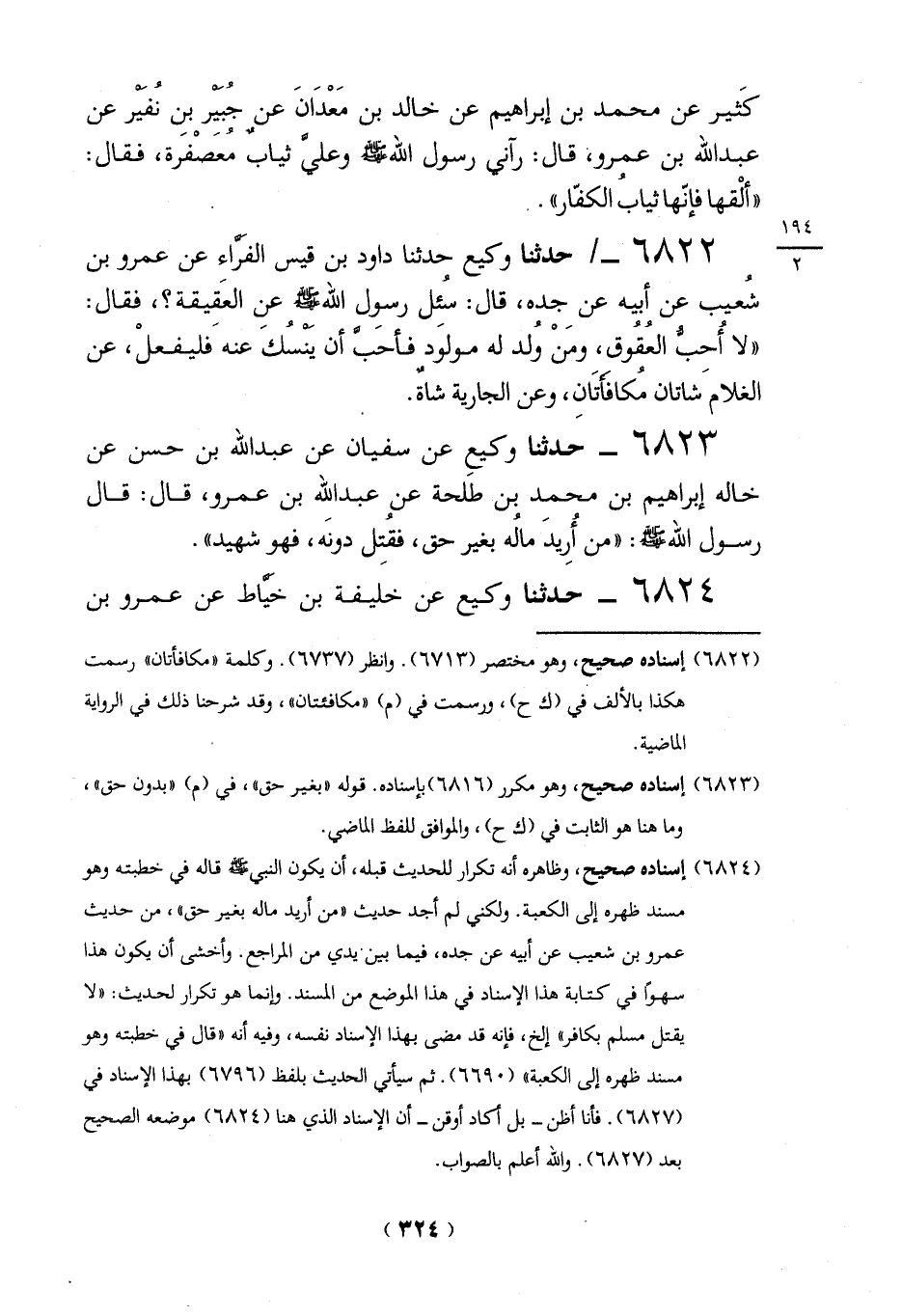 (6824) إسناده صحيح، وظاهره أنه تكرار للحديث قبله، أن يكون النبي -صلي الله عليه وسلم - قاله في خطبته وهو مسند ظهره إلى الكعبة. ولكني لم أجد حديث "من أريد ماله بغير حق"، من حديث عمرو بن شعيب عن أبيه عن جده، فيما بين يدي من المراجع. وأخشى أن يكون هذا سهواً في كتابة هذا الإسناد في هذا الموضع من المسند. وإنما هو تكرار لحديث: "لا يقتل مسلم بكافر" إلخ، فإنه قد مضى بهذا الإسناد نفسه، وفيه أنه "قال في خطبته وهو مسند ظهره إلى الكعبة" (6690). ثم سيأتي الحديث بلفظ (6796) بهذا الإسناد في (6827). فأنا أظن- بل أكاد أوقن- أن الإسناد الذي هنا (6824) موضعه الصحيح بعد (6827). والله أعلم بالصواب.