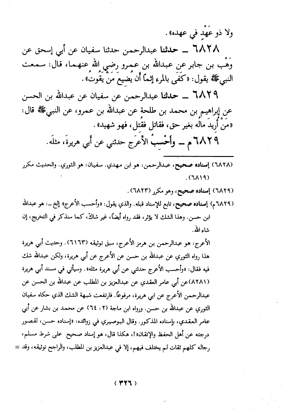 6829 - حدثنا عبد الرحمن عن سفيان عن عبد الله بن الحسن عن إبراهيم بن محمَّد بن طلحة عن عبد الله بن عمرو، عن النبي -صلي الله عليه وسلم - قال: "مَنْ أرِيدَ مالُه بغير حق، فقاتل فقُتِل، فهو شهيد".