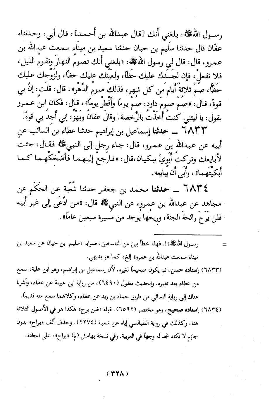 = رسول الله -صلي الله عليه وسلم -"!. فهذا خطأ بين من الناسخين، صوابه "سليم بن حيان عن سعيد بن ميناء سمعت عبد الله بن عمرو" إلخ، كما هو بديهي.