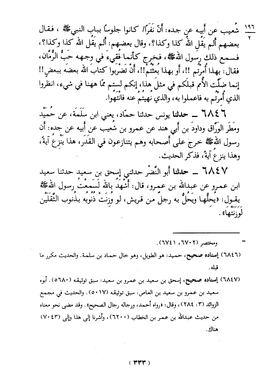 6846 - حدثنا يونس حدثنا حمّاد، يعني ابن سَلَمَة، عن حُميد ومَطر الوَرَّاق وداودَ بن أبي هند عن عمرو بن شُعيب عن أبيه عن جده: أَن رسول الله -صلي الله عليه وسلم - خرج على أصحابه وهم يتنازعون في القَدَر، هذا ينزِع آيةً، وهذا ينزعُ آيةً، فذكر الحديث.