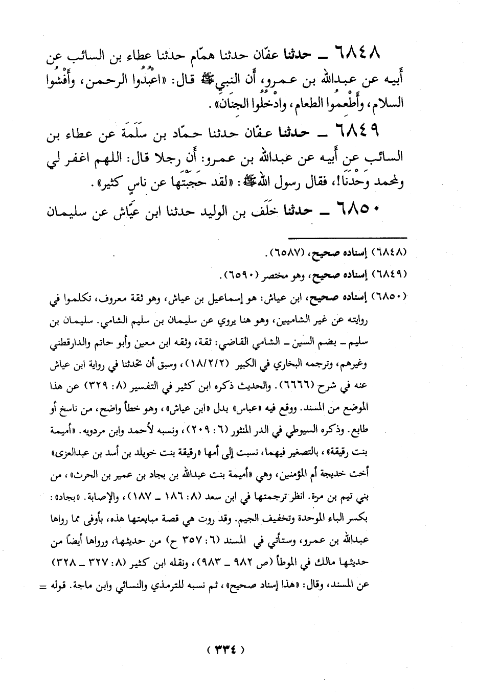 6848 - حدثنا عفّان حدثنا همّام حدثنا عطاء بن السائب عن أبيه عن عبد الله بن عمرو، أَن النبيِ - صلى الله عليه وسلم - قال: "اعبُدُوا الرحمن، وأفْشُوا السلام، وأَطْعمُوا الطعام، وادْخُلُوا الجِنَان".