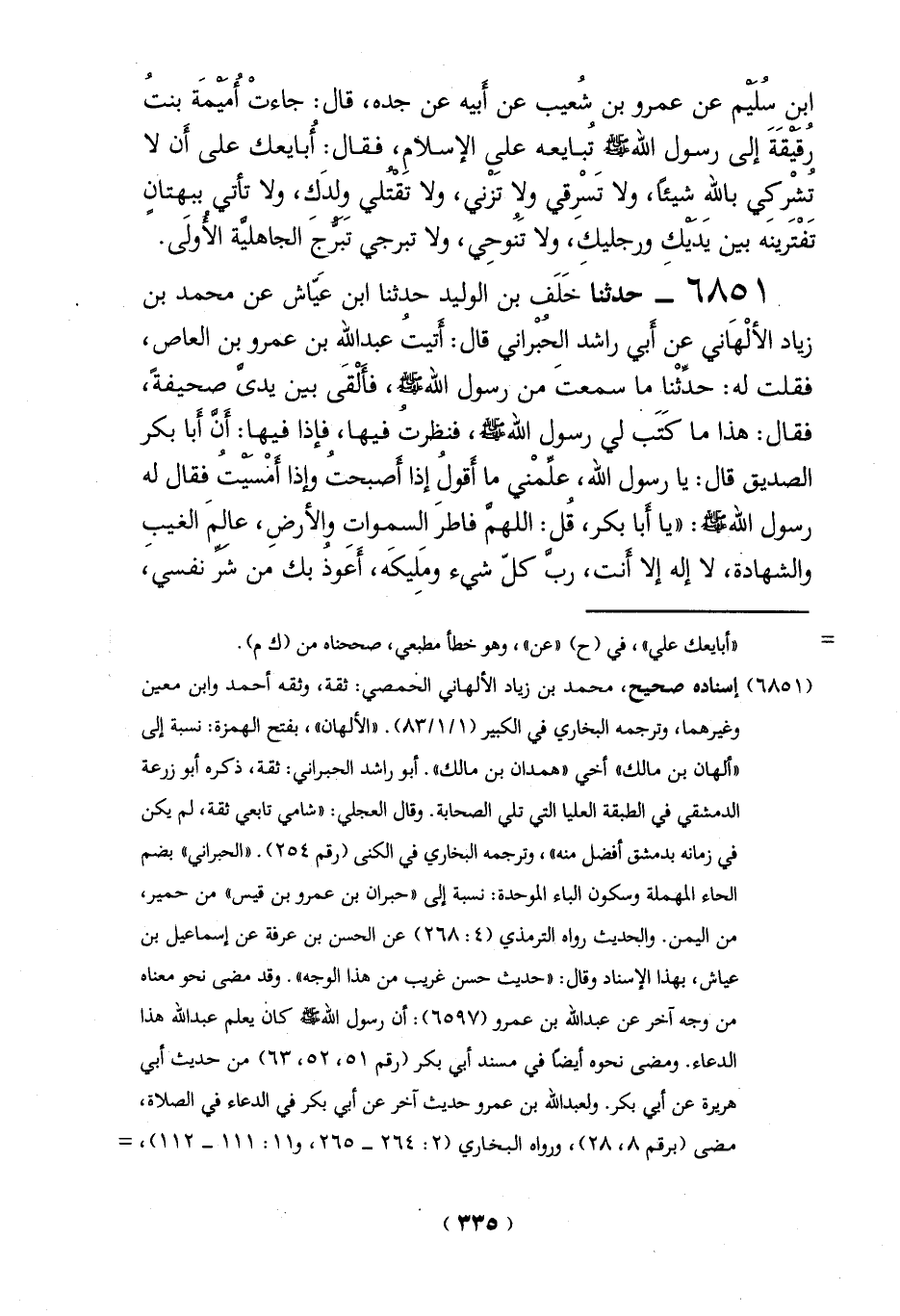 6851 - حدثنا خَلَف بن الوليد حدثنا ابن عَيّاش عن محمَّد بن زياد الألْهَاني عن أبي راشد الحُبْراني قال: أتيتُ عبد الله بن عمرو بن العاص، فقلت له: حدِّثْنا ما سمعت من رسول الله -صلي الله عليه وسلم -، فألقَى بين يدىَّ صحيفةً، فقال: هذا ما كَتَب لي رسول الله -صلي الله عليه وسلم -، فنظرتُ فيها، فإذا فيها: أَنَّ أَبا بكر الصديق قال: يا رسول الله، علِّمْني ما أقولُ إذا أصبحتُ وإذا أمسيتُ فقال له رسول الله -صلي الله عليه وسلم -: "يا أبا بكر، قُل: اللهمَّ فاطرَ السموات والأرضِ، عالم الغيبِ والشهادة، لا إله إلا أنت، ربَّ كلّ شيء ومَلِيكَه، أَعَوذُ بك من شر نفسي،