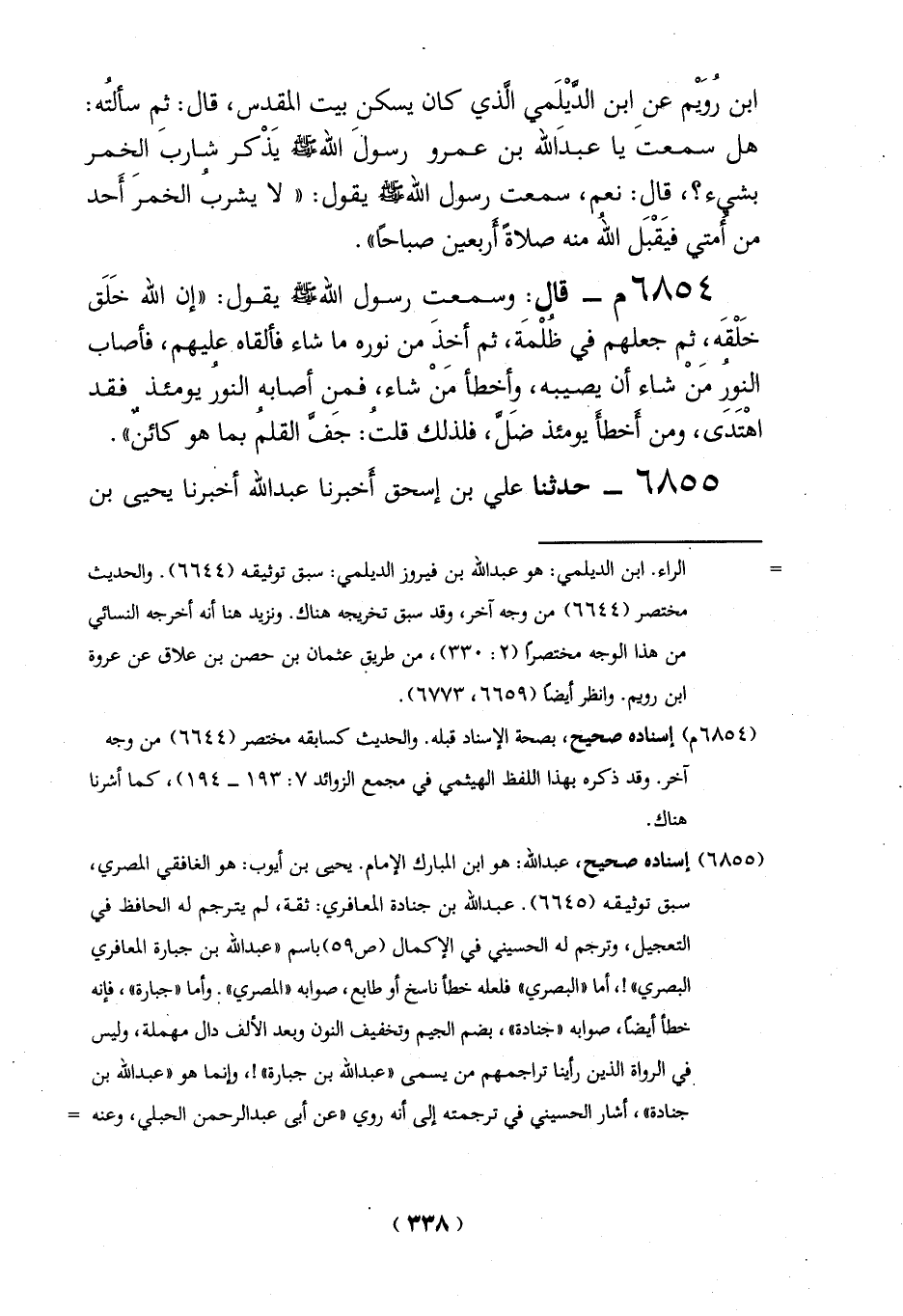 = الراء. ابن الديلمي: هو عبد الله بن فيروز الديلمي: سبق توثيقه (6644). والحديث مختصر (6644) من وجه آخر، وقد سبق تخريجه هناك. ونزيد هنا أنه أخرجه النسائي من هذا الوجه مختصراً (2: 330)، من طريق عثمان بن حصن بن علاق عن عروة ابن رويم. وانظر أيضاً (6659، 6773).