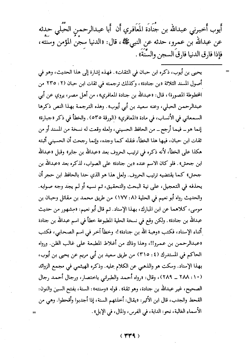 أَيوب أخبرني عبد الله بن جُنَادَة المَعَافري أَن أَبا عبد الرحمن الحُبُلي حدثه عن عبد الله بن عمرو، حدثه عن النبي -صلي الله عليه وسلم -، قال: "الدنيا سجْن المؤمن وسَنَته، فإذا فارق الدنيا فارقَ السجن والسَّنَةَ".