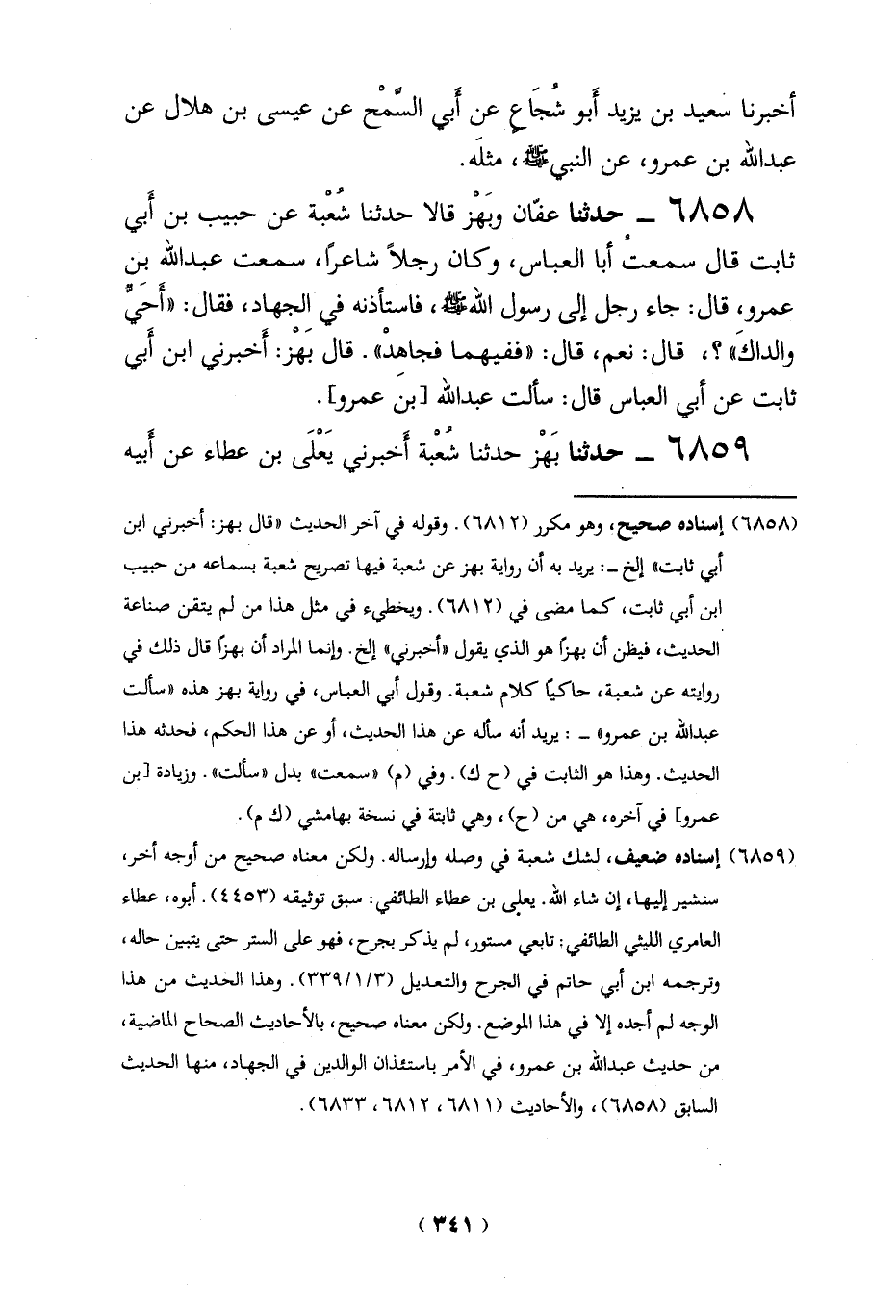 6858 - حدثنا عفّان وبَهْز قالا حدثنا شُعْبة عن حبيب بن أَبي ثابت قال سمعتُ أبا العباس، وكان رجلاً شاعراً، سمعت عبد الله بن عمرو، قال: جاء رجل إلى رسول الله -صلي الله عليه وسلم -، فاستأذنه في الجهاد، فقال: "أَحَيٌّ والداكَ"؟، قال: نعم، قال: "ففيهما فجاهِدْ". قال بَهْز: أخبرني ابن أبي