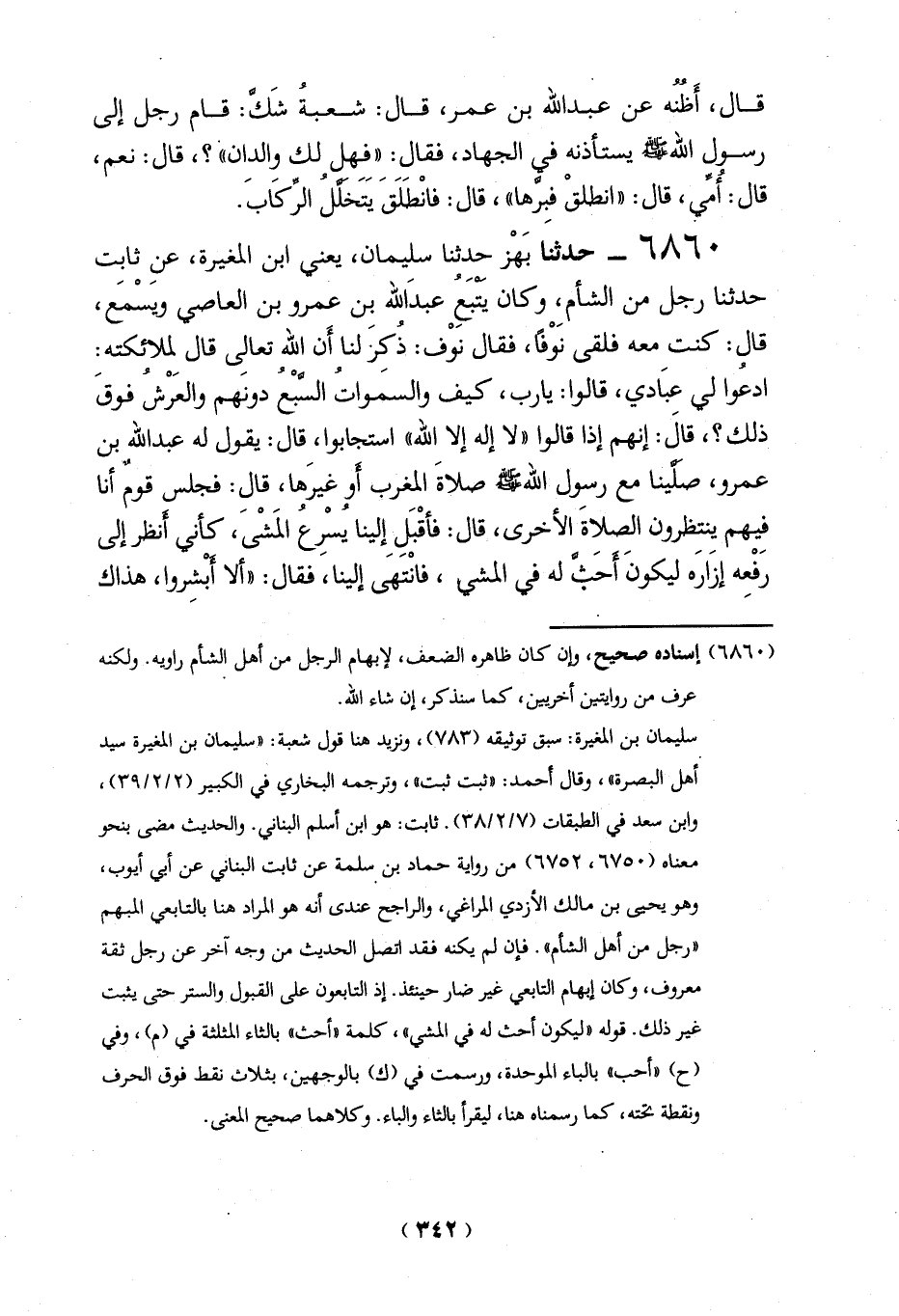 6860 - حدثنا بَهْز حدِثنا سليمان، يعني ابن المغيرة، عنِ ثابِت حدثنا رجل من الشأم، وكان يتبعُ عبدَ الله بن عمرو بن العاصي ويسْمع، قال: كنت معه فلقى نوْفاً، فقال نوْف: ذُكرَ لنا أَن الله تعالِى قال لملائكته: ادعُوا لي عبَادي، قالوا: يا رب، كيف والسمَواتُ السَّبْعُ دونهم والعَرْش فوقَ ذلك؟، قالَ: إنهم إذا قالوا "لا إله إلا الله" استجابوا، قال: يقول له عبد الله بن عمرو، صلَّينا مع رسول الله -صلي الله عليه وسلم - صلاةَ المغرب أو غيرَها، قال: فجلس قومٌ أنا فِيهم ينتظرون الصلاةَ الأخرى، قال: فأقْبَلِ إلينا يسْرِع المَشْىَ، كأني أنظر إلى رفْعِه إزَارَه ليكونَ أحَثَّ له في المشي، فانْتهَى إلينا، فقال: "ألا أبْشِروا، هذاك