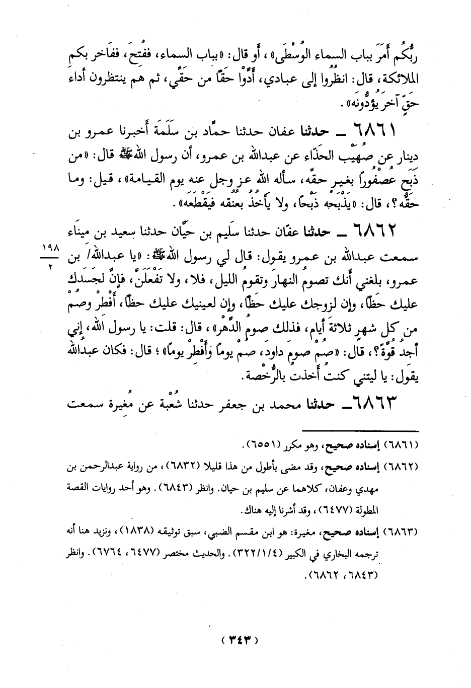 6861 - حدثنا عفان حدثنا حمَّاد بن سَلَمَة أَخبرنا عمرو بن ديِنار عن صُهَيْب الحَذّاء عن عبد الله بن عمرو، أن رسول الله -صلي الله عليه وسلم - قال: "من ذَبح عُصْفُوراً بغير حقِّه، سأله الله عز وجل عنه يوم القيامة"، قيل: وما حَقُّه؟، قال: "يَذْبَجه دبحاً , ولا يأخذ بعنُقه فيَقْطَعَه".