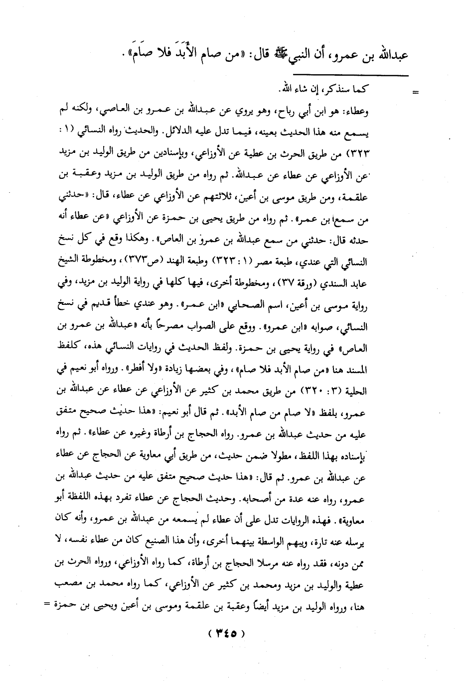 المسند هنا "من صام الأبد فلا صام"، وفي بعضها زيادة "ولا أفطر". ورواه أبو نعيم في الحلية (3: 320) من طريق محمَّد بن كثير عن الأوزاعي عن عطاء عن عبد الله بن عمرو، بلفظ "لا صام من صام الأبد". ثم قال أبو نعيم: "هذا حديث صحيح متفق عليه من حديث عبد الله بن عمرو. رواه الحجاج بن أرطأة وغيره عن عطاء". ثم رواه بإسناده بهذا اللفظ، مطولاً ضمن حديث، من طريق أبي معاوية عن الحجاج عن عطاء عن عبد الله بن عمرو. ثم قال: "هذا حديث صحيح متفق عليه من حديث عبد الله بن عمرو، رواه عنه عدة من أصحابه. وحديث الحجاج عن عطاء تفرد بهذه اللفظة أبو معاوية". فهذه الروايات تدل على أن عطاء لم يسمعه من عبد الله بن عمرو، وأنه كان يرسله عنه تارة، ويبهم الواسطة بينهما أخرى، وأن هذا الصنيع كان من عطاء نفسه، لا ممن دونه، فقد رواه عنه مرسلاً الحجاج بن أرطأة، كما رواه الأوزاعي , ورواه الحرث بن عطية والوليد بن مزيد ومحمد بن كثير عن الأوزاعي، كما رواه محمَّد بن مصعب هنا، ورواه الوليد بن مزيد أيضاً وعقبة بن علقمة وموسى بن أعين ويحيى بن حمزة =