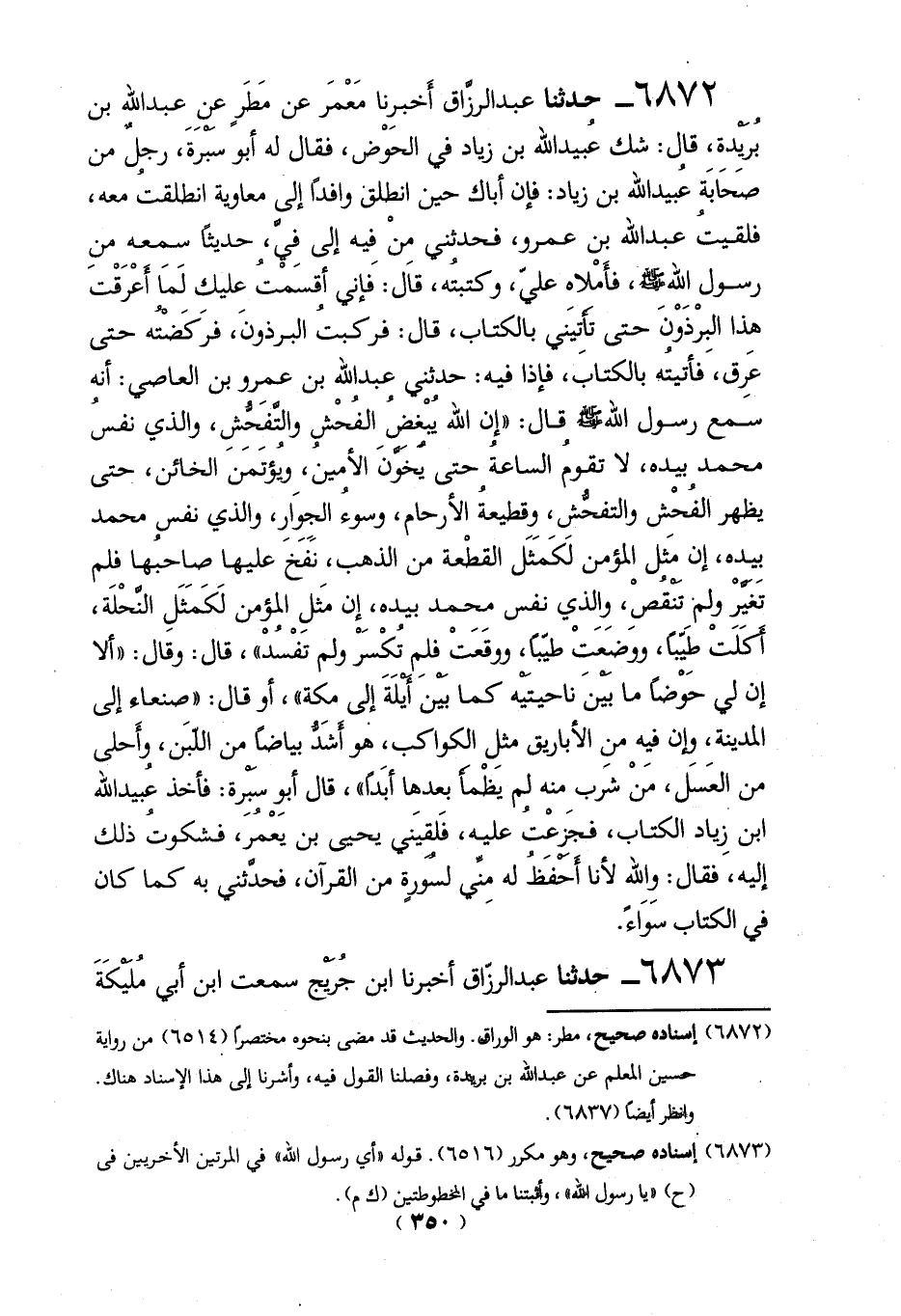 6872 - حدثنا عبد الرزَّاق أَخبرنا مَعْمَر عن مَطرٍ عنِ عبد الله بن بُرَيْدة، قال: شك عُبيد الله بن زياد في الحَوْض، فقال له أبو سبرةَ، رجلٌ من صَحَابَة عُبيد الله بن زياد: فإن أباك حين انطلق وافداً إلى معاوية انطلقتُ معه، فلقيتُ عبد الله بن عمرو، فحدثني منْ فيه إلى فيَّ، حديثاً سمعه منِ رسول الله -صلي الله عليه وسلم -، فأَمْلاهِ عليّ، وكتبتُه، قاَل: فَإني أقسَمْتُ عليك لَمَا أعْرَقْتَ هذا البِرْذَوْنَ حتى تأتيني بالكتاب، قال: فركبتُ البرذونَ، فرَكَضته حتى عَرِق، فأتيتُه بالكتاب، فإذا فيه: حدثني عبد الله بن عمرو بن العاصي: أنه سمع رسول الله -صلي الله عليه وسلم - قال: "إن الله يُبْغضُ الفُحْش والتَّفَحُّش، والذي نفسُ محمَّد بيده، لا تقوُم الساعةُ حتى يُخوَّنَ الأمينُ، ويُؤتَمَنَ الخائن، حتى يظهر الفُحْش والتفحُّش، وقطيعةُ الأرحام، وسوءُ الجِوِارِ، والذي نفس محمَّد بيده، إن مَثل المؤمن لَكَمَثَل القطْعة من الذهب، نفخ عليها صاحبُها فلم تَغيَّرْ ولم تَنْقُصْ، وِاِلذي نفس محمَّد بيده، إن مَثلِ المؤمن لَكَمَثَلِ النَّحْلَة، أكَلَتْ طِيّباً، ووضعتْ طيّباً، ووقَعَتْ فلم تُكْسَرْ ولم تَفْسُدْ"، قال: وقال: "ألا إن لي حوْضاً ما بينَ ناحيتيه كما بينَ أَيْلَةَ إلى مكة"، أو قال: "صنعاء إلى المدينة، وإن فيِه منِ الأباريق مثل الكواكب، هو أشَدُّ بياضاً من اللّبَن، وأَحلى من العَسَل، منْ شَرب منه لم يَظْمأَ بعدها أبَداً"، قال أبوِ سَبرة: فأخذ عُبيد الله ابن زِياد الكتاب، فجَزعتُ عليه، فَلقيَني يحيى بن يعْمُرَ، فشكوتُ ذلك