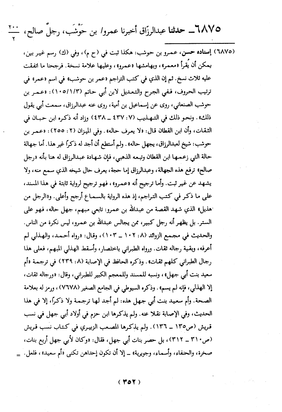 (6875) إسناده حسن، عمرو بن حوشب: هكذا ثبت في (ح م)، وفي (ك) رسم غير بين، يمكن أن يُقرأ "معمر"، وبهامشها "عمرو"، وعليها علامة نسخة. فرجحنا ما أتفقت عليه ثلاث نسخ. ثم إن الذي في كتب التراجم "عمر بن حوشب" في اسم "عمر" في ترتيب الحروف، ففي الجرح والتعديل لابن أبي حاتم (3/ 1/ 105): "عمر بن حوشب الصنعاني، روى عن إسماعيل بن أمية، روى عنه عبد الرزاق، سمعت أبي يقول ذلك". ونحو ذلك في التهذيب (7: 437 - 438) وزاد أنه ذكره ابن حبان في الثقات، وأن ابن القطان قال: "لا يعرف حاله". وفي الميزان (2: 255): "عمر بن حوشب: شيخ لعبد الرزاق، يجهل حاله". ولم أستطع أن أجد له ذكراً غير هذا. أما جهالة حالة التي زعمها ابن القطان وتبعه الذهبي، فإن شهادة عبد الرزاق له هنا بأنه "رجل صالح" ترفع هذه الجهالة، وعبد الرزاق إما حجة، يعرف حال شيخه الذي سمع منه، ولا يشهد عن غير ثبت. وأما ترجيح أنه "عمرو"، فهو ترجيح لرواية ثابتة في هذا المسند، على ما ذكر في كتب التراجم، إذ هذه الرواية بالسماع أرجح وأعلى. و"الرجل من هذيل" الذي شهد القصة من عبد الله بن عمرو: تابعي مبهم، جهل حاله، فهو على الستر. بل يظهر أنه رجل كبير، ممن يجالس عبد الله بن عمرو، ليس نكرة من الناس.