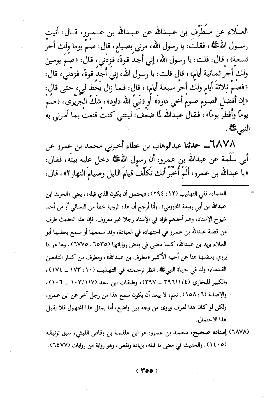 = العلماء، ففي التهذيب (12: 294): "يحتمل أن يكون الذي قبله"، يعني "الحرث ابن عبد الله بن أبي ربيعة المخزومي". وأنا أرجح أن هذه الرواية خطأ من النسائي أو من أحد شيوخ الإسناد، وهم أحدهم فزاد في الإسناد رجلاً غير معروف. فإن هذا الحديث طرف من قصة عبد الله بن عمرو في اجتهاده في العبادة، وقد سمعها أو سمع بعضها أبو العلاء يزيد بن عبد الله، كما مضى في بعض رواياتها (6535، 6775)، وها هو ذا يروي بعضها هنا عن أخيه الأكبر "مطرف بن عبد الله"، ومطرف من كبار التابعين القدماء، ولد في حياة النبي -صلي الله عليه وسلم -. انظر ترجمته في التهذيب (10: 173 - 174)، والكبير للبخاري (4/ 1/396 - 397)، وطبقات ابن سعد (7/ 1/103 - 106)، والإصابة (6: 158). نعم، لا يبعد أن يكون سمع هذا من رجل آخر عن ابن عمرو، ولكن لو كان هذا لعرف وروي من وجه بين واضح، أما بمثل هذا المجهول فلا يقبل هذا الاحتمال.