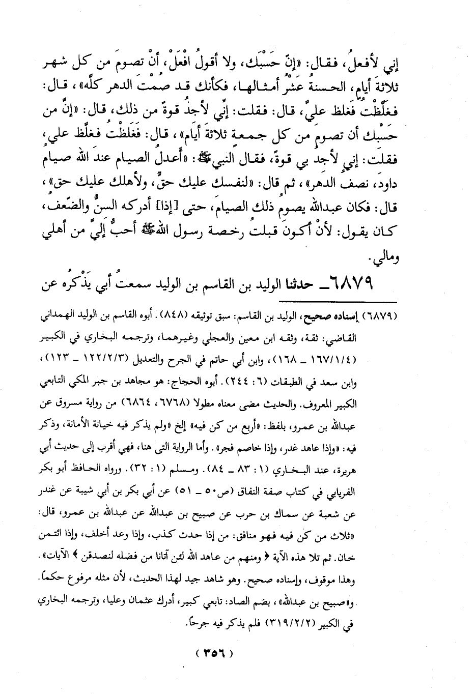 إني لأفعلُ، فقال: "إنّ حَسْبَك، ولا أقولُ افْعَلْ، أنْ تصومَ من كل شهر ثلاثةَ أيام، الحسنةُ عَشْرُ أمثالها، فكأنك قد صمْتَ الدهر كلَّه"، قال: فغلَّظْتُ فَغلظ علِيَّ، قال: فقلت: إنِّي لأجدُ قوةً من ذلك، قال: "إنَّ من حَسْبك أن تصوم من كل جمعةٍ ثلاثةَ أيَام"، قال: فَغَلظْتُ فغلَّظ علي، فقلتَ: إني لأجد بي قوةً، فقال النبي -صلي الله عليه وسلم -: "أعدلُ الصيام عندَ الله صيامُ داودَ، نصفُ الدَهر"، ثم قال: "لنفسك عليك حقُّ، ولأهلك عليك حق"، قال: فكان عبد الله يصوِمُ ذلك الصيامَ، حتى [إذا] أدركه السنُّ والضّعفُ، كان يقول: لأنْ أكون قبلتُ رخصة رسول الله -صلي الله عليه وسلم - أحبُّ إَليَّ من أهلي ومالي.