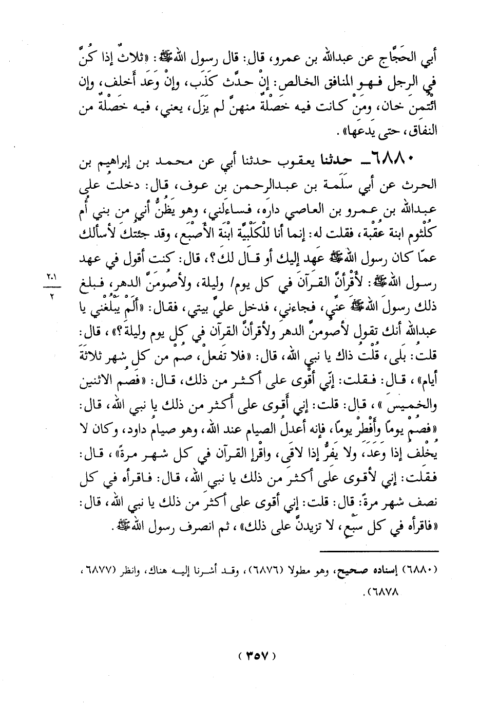 6880 - حدثنا يعقوب حدثنا أبي عن محمَّد بن إبراهيم بن الحرث عن أبي سَلَمة بن عبد الرحمن بن عوف، قال: دخلتُ على عبد الله بن عمرو بن العاصي دارَه، فساءَلني، وهِو يَظُنُّ أني من بني أُم كُلْثوم ابنة عُقْبة، فقلت له: إنما أنا للْكَلْبيَّة ابْنَة الأصْبع، وقد جئتُكَ لأسألك عمّا كان رسول الله -صلي الله عليه وسلم - عَهِد إليك أو قاَل لكَ؟، قال: كنت أقول في عهد رسول الله -صلي الله عليه وسلم -: لأقْرأنَّ القرآنَ في كل يوم وليلة، ولأصُومَنَّ الدهر، فبلغ ذلك رسولَ الله - صلى الله عليه وسلم -عنيِّ، فجاءنيِ، فدخل عليَّ بيتي، فقال: "ألَم يبلُغْني يا عبد الله أنك تقول لأصومنَّ الدهر ولأقرأنَّ القرآن في كل يوم وليلة؟ "، قالِ: قلتُ: بَلى، قُلْتُ ذاك يا نبي الله، قال: "فلا تَفعلْ، صُمْ من كلِ شهر ثلاثةَ أيام"، قال: فقلت: إنّي أقْوى على أكثر من ذلك، قال: "فصُم الاثنين والخميسَ"، قال: قلت: إني أَقوى على أكثر من ذلك يا نبي الله، قال: "فصُمْ يوماً وأفطرْ يوماً، فإنه أعدلُ الصيام عند الله، وهو صيام داود، وكان لا يُخْلفُ إذا وَعَدَ، ولا يَفرُّ إذا لاقَى، واقْرإ القرآن في كل شهر مرةً"، قال: فقَلت: إني لأقوى عَلى أكثرَ من ذلك يا نبي الله، قال: فاقرأه في كل نصف شهر مرةً: قال: قلت: إني أقوى على أكثرَ من ذلك يا نبي الله، قال: "فاقرأه في كل سبعٍ، لا تزيدنَّ على ذلك"، ثم انصرف رسول الله -صلي الله عليه وسلم -.