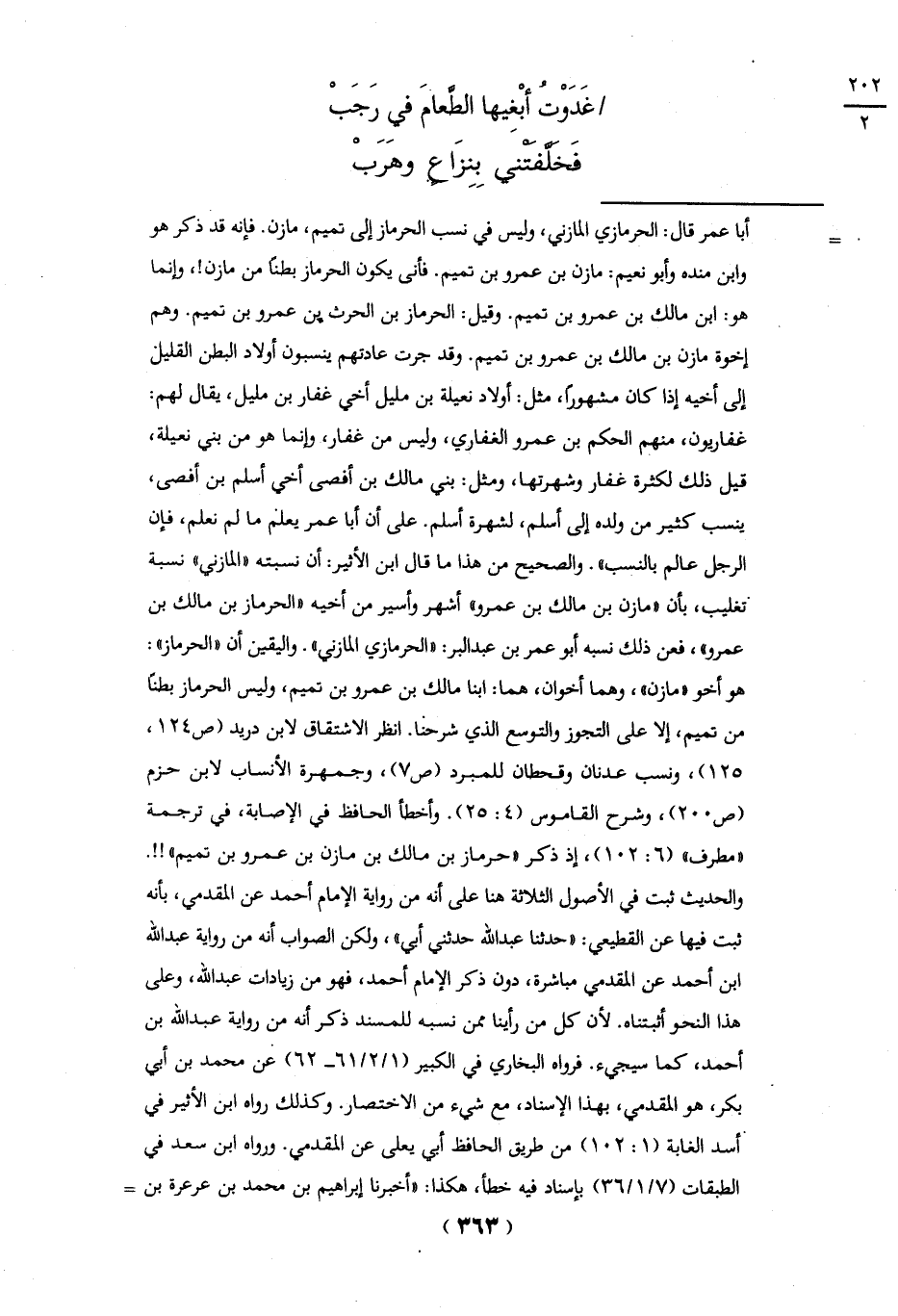 = أبا عمر قال: الحرمازي المازني، وليس في نسب الحرماز إلى تميم، مازن. فإنه قد ذكر هو وابن منده وأبو نعيم: مازن بن عمرو بن تميم. فأنى يكون الحرماز بطناً من مازن!، وإنما هو: ابن مالك بن عمرو بن تميم. وقيل: الحرماز بن الحرث بن عمرو بن تميم. وهم إخوة مازن بن مالك بن عمرو بن تميم. وقد جرت عادتهم ينسبون أولاد البطن القليل إلى أخيه إذا كان مشهوراً، مثل: أولاد نعيلة بن مليل أخي غفار بن مليل، يقال لهم: غفاريون، منهم الحكم بن عمرو الغفاري، وليس من غفار، وإنما هو من بني نعيلة، قيل ذلك لكثرة غفار وشهرتها، ومثل: بني مالك بن أفصى أخي أسلم بن أفصى، ينسب كثير من ولده إلى أسلم، لشهرة أسلم. على أن أبا عمر يعلم ما لم نعلم، فإن الرجل عالم بالنسب". والصحيح من هذا ما قال ابن الأثير: أن نسبته "المازني" نسبة تغليب، بأن "مازن بن مالك بن عمرو" أشهر وأسير من أخيه "الحرماز بن مالك بن عمرو"، فعن ذلك نسبه أبو عمر بن عبد البر: "الحرمازي المازني". واليقين أن "الحرماز": هو أخو "مازن"، وهما أخوان، هما: ابنا مالك بن عمرو بن تميم، وليس الحرماز بطناً من تميم، إلا على التجوز والتوسع الذي شرحنا. انظر الاشتقاق لابن دريد (ص 124،