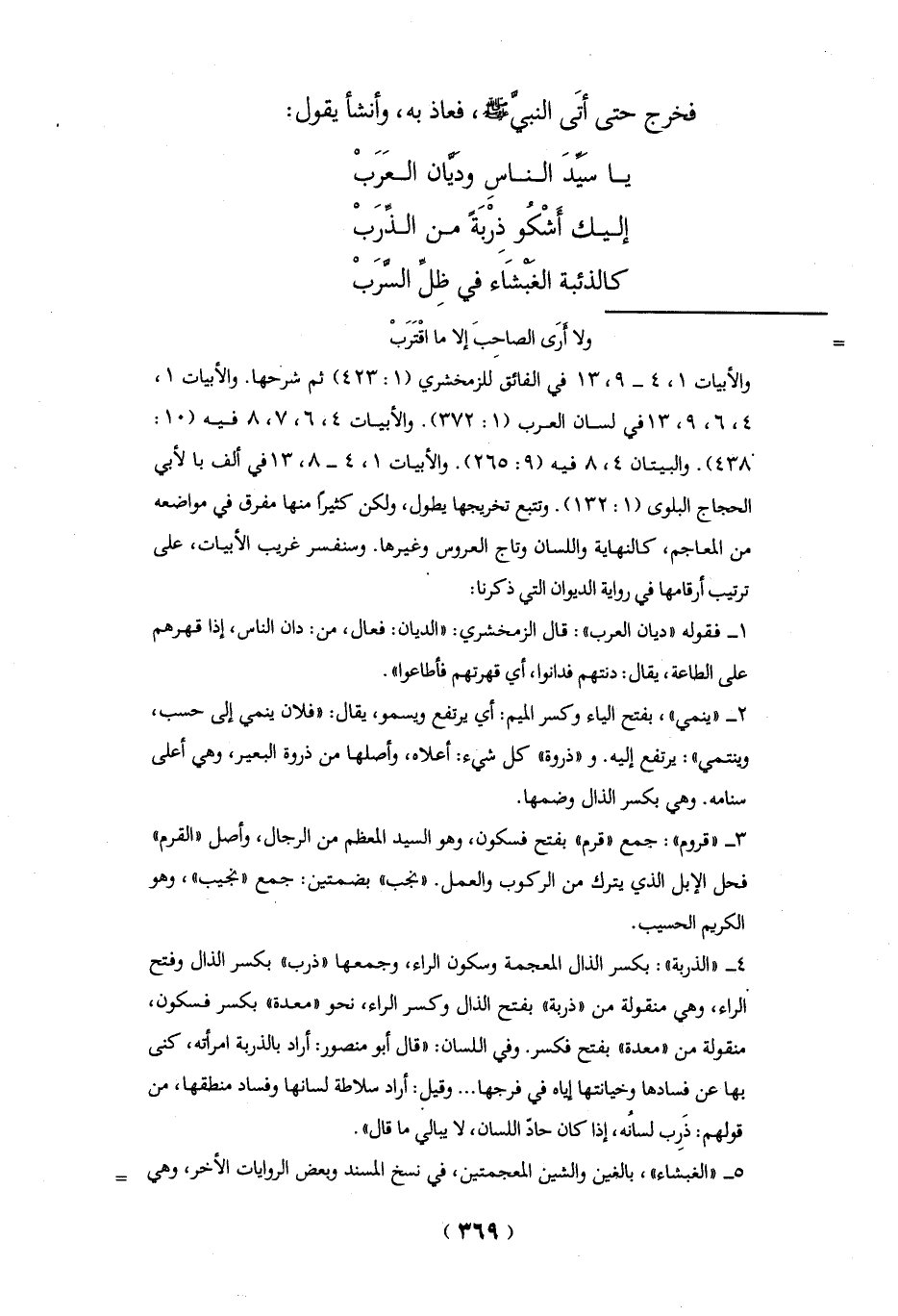 4 - "الذربة": بكسر الذال المعجمة وسكون الراء، وجمعها "ذرب" بكسر الذال وفتح الراء، وهي منقولة من "ذربة" بفتح الذال وكسر الراء، نحو "معدة" بكسر فسكون، منقولة من "معدة" بفتح فكسر. وفي اللسان: "قال أبو منصور: أراد بالذربة أمرأته, كنى بها عن فسادها وخيانتها إياه في فرجها ... وقيل: أراد سلاطة لسانها وفساد منطقها، من قولهم: ذَرِب لسانُه، إذا كان حاد اللسان، لا يبالي ما قال".