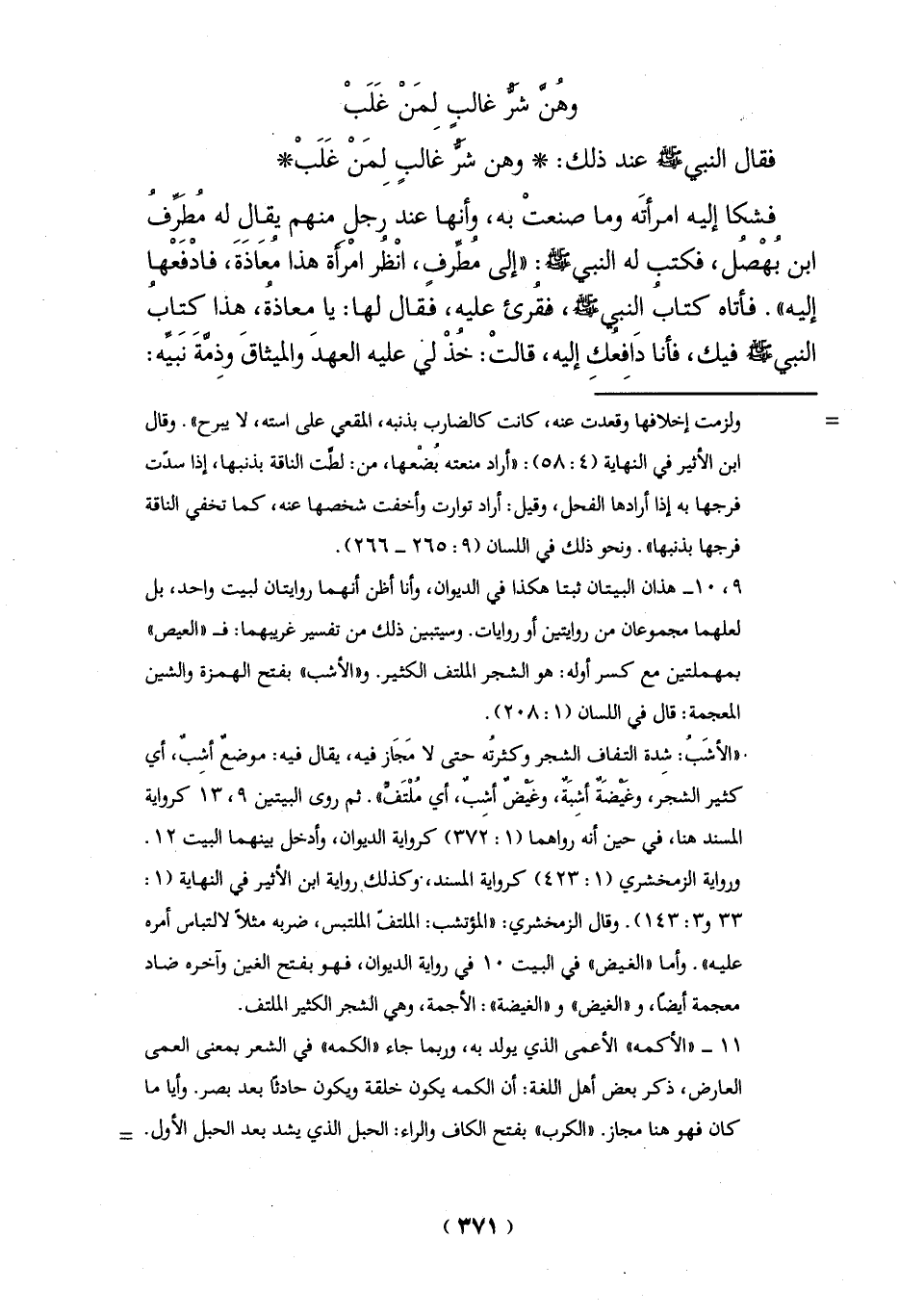 ورواية الزمخشري (1: 423) كرواية المسند، وكذلك رواية ابن الأثير في النهاية (1: 33 و3: 143). وقال الزمخشري: "المؤتشب: الملتفّ الملتبس، ضربه مثلاً لالتباس أمره عليه". وأما "الغيض" في البيت 10 في رواية الديوان، فهو بفتح الغين وآخره ضاد معجمة أيضاً، و"الغيض" و "الغيضة": الأجمة، وهي الشجر الكثير الملتف.