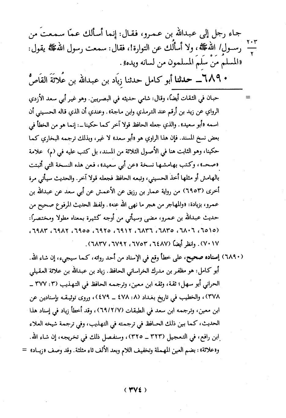 = حبان في الثقات أيضاً، وقال: شامي حديثه في البصريين. وهو غير أبي سعد الأزدي الرواي عن زيد بن أرقم عند الترمذي وابن ماجة". وعندي أن الذي قاله الحسيني أن اسمه "أبو سعيد". والذي جعله الحافظ قولا آخر كما حكينا-: إنما هو من الخطأ في بعض نسخ المسند. فإن هذا الراوي هو "أبو سعد" لا غير، وبذلك ترجمه البخاري كما حكينا، وهو الثابت هنا في الأصول الثلاثة من المسند، بل كتب عليه في (م) علامة "صحـ"، وكتب بهامشها نسخة "عن أبي سعيد"، فعن هذه النسخة التي أثبتت بالهامش أو مثلها أخذ الحسيني، وتبعه الحافظ فجعله قولاً آخر. والحديث سيأتي مرة أخرى (6953) من رواية عمار بن رزيق عن الأعمش عن أبي سعد عن عبد الله بن عمرو، بزيادة: "والمهاجر من هجر ما نهى الله عنه". ولفظ الحديث المرفوع صحيح من حديث عبد الله بن عمرو، مضى وسيأتي من أوجه كثيرة بمعناه مطولاً ومختصراً: (6515، 6806، 6835، 6836، 6912، 6925، 6955، 6982، 6983، -7017). وانظر أيضاً (6487، 6753، 6792، 6837).