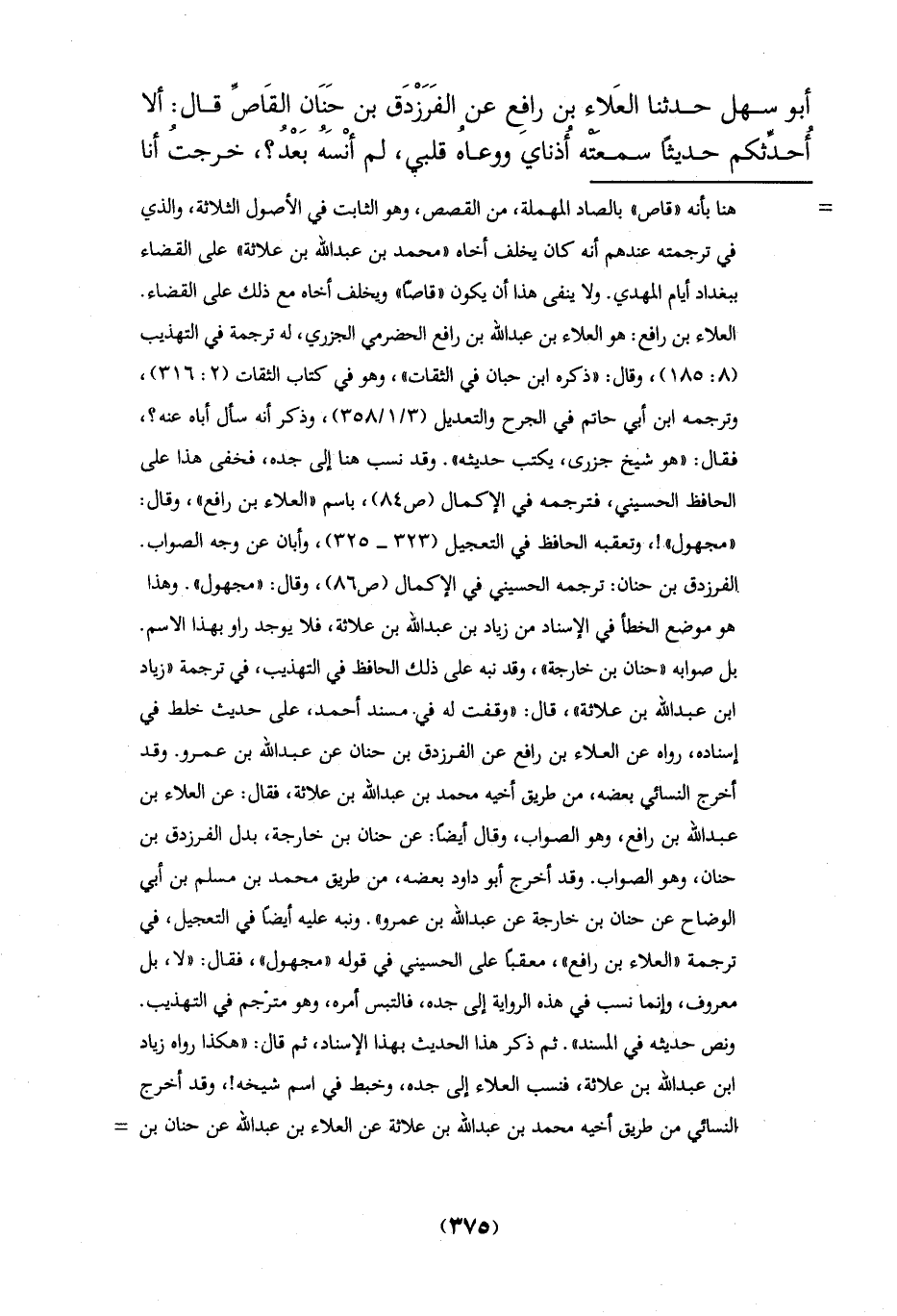 الوضاح عن حنان بن خارجة عن عبد الله بن عمرو". ونبه عليه أيضاً في التعجيل، في ترجمة "العلاء بن رافع"، معقباً على الحسيني في قوله "مجهول"، فقال: "لا، بل معروف، وإنما نسب في هذه الرواية إلى جده، فالتبس أمره، وهو مترجم في التهذيب.