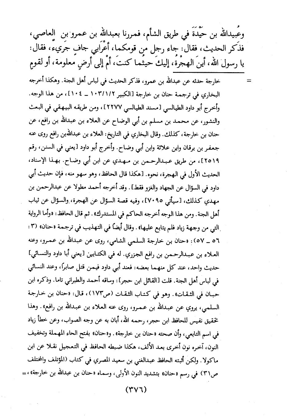 وأخرج أبو داود الطيالسي [مسند الطيالسي 2277]، ومن طريقه البيهقي في البعث والنشور، عن محمَّد بن مسلم بن أبي الوضاح عن العلاء بن عبد الله بن رافع، عن حنان بن خارجة، كذلك. وقال البخاري في التاريخ: العلاء بن عبد الله بن رافع روى عنه جعفر بن برقان وابن علاثة وابن أبي وضاح. وأخرج أبو داود [يعني في السنن ,رقم 2519]، من طريق عبد الرحمن بن مهدي عن ابن أبي وضاح. بهذا الإسناد، الحديث الأول في الهجرة، نحوه. [هكذا قال الحافظ، وهو سهو منه، فإن حديث أبي داود في السؤال عن الجهاد والغزو فقط]. وقد أخرجه أحمد مطولاً عن عبد الرحمن بن