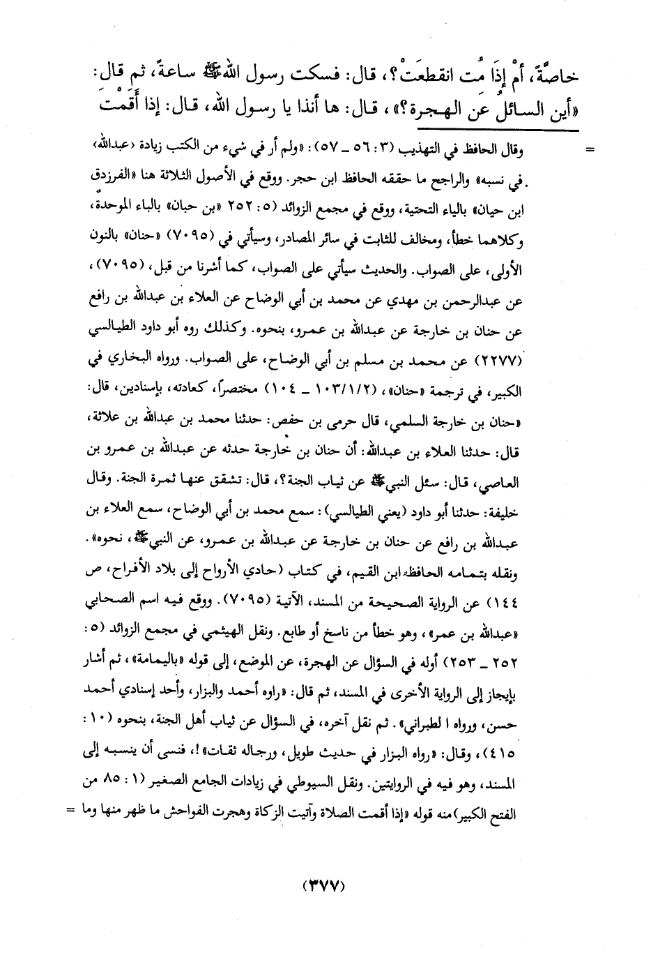 ونقله بتمامه الحافابن القيم، في كتاب (حادىِ الأرواح إلى بلاد الأفراح، ص 144) عن الرواية الصحيحة من المسند، الآتية (7095). ووقع فيه اسم الصحابي "عبد الله بن عمر"، وهو خطأ من ناسخ أو طابع. ونقل الهيثمي في مجمع الزوائد (5: 252 - 253) أوله في السؤال عن الهجرة، عن الموضع، إلى قوله "باليمامة"، ثم أشار بإيجاز إلى الرواية الأخرى في المسند، ثم قال: "راوه أحمد والبزار، واحد إسنادي أحمد حسن، ورواه الطبراني". ثم نقل آخره، في السؤال عن ثياب أهل الجنة، بنحوه (10: 415)، وقال: "رواه البزار في حديث طويل، ورجاله ثقات"!، فنسى أن ينسبه إلى المسند، وهو فيه في الروايتين. ونقل السيوطي في زيادات الجامع الصغير (1: 85 من الفتح الكبير) منه قوله "إذا أقمت الصلاة وآتيت الزكاة وهجرت الفواحش ما ظهر منها وما =