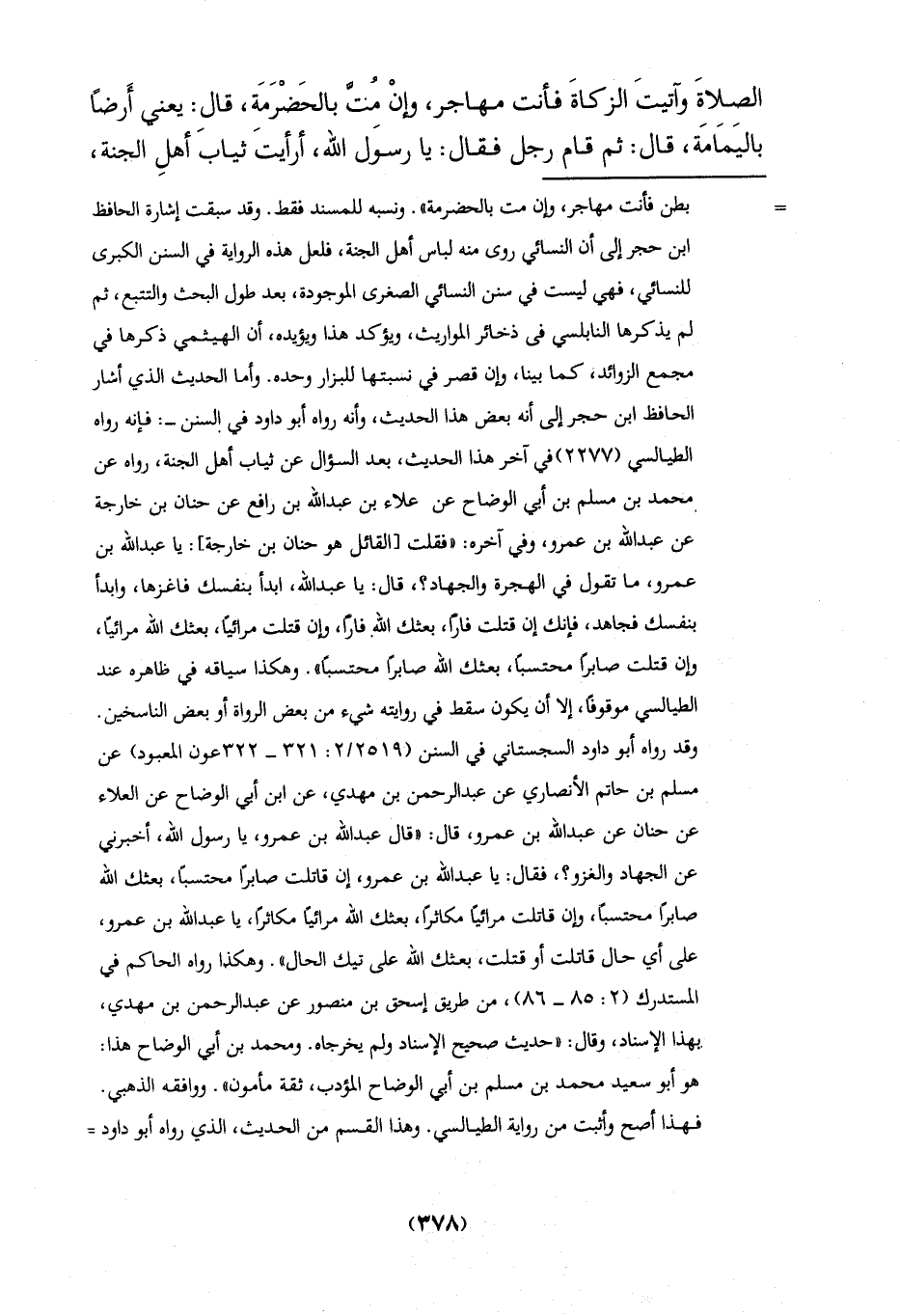 وقد رواه أبو داود السجستاني في السنن (2519/ 2: 321 - 322 عون المعبود) عن مسلم بن حاتم الأنصاري عن عبد الرحمن بن مهدي، عن ابن أبي الوضاح عن العلاء عن حنان عن عبد الله بن عمرو، قال: "قال عبد الله بن عمرو، يا رسول الله، أخبرني عن الجهاد والغزو؟، فقال: يا عبد الله بن عمرو، إن قاتلت صابراً محتسباً، بعثك الله صابراً محتسباً، وإن قاتلت مرائياً مكاثراً، بعثك الله مرائياً مكاثراً، يا عبد الله بن عمرو، على أي حال قاتلت أو قتلت، بعثك الله على تيك الحال". وهكذا رواه الحاكم في المستدرك (2: 85 - 86)، من طريق إسحق بن منصور عن عبد الرحمن بن مهدي، بهذا الإسناد، وقال: "حديث صحيح الإسناد ولم يخرجاه. ومحمد بن أبي الوضاح هذا: هو أبو سعيد محمَّد بن مسلم بن أبي الوضاح المؤدب، ثقة مأمون". ووافقه الذهبي.